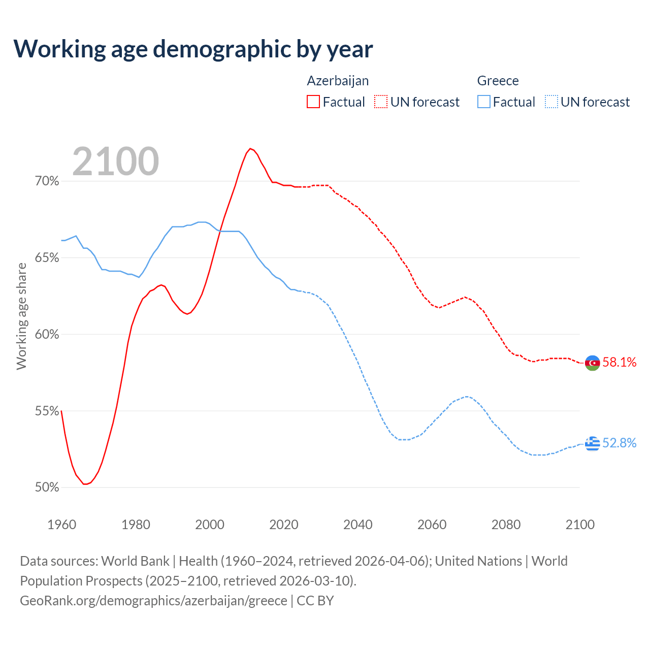 - The share of old-age demographic (65+) in Azerbaijan is 8.56% vs 23.9% in Greece.
