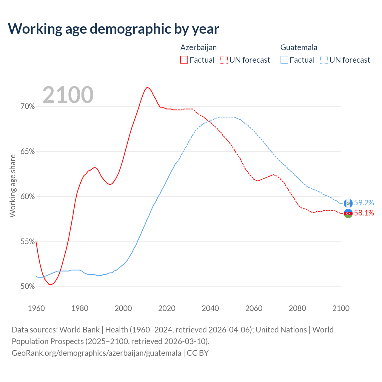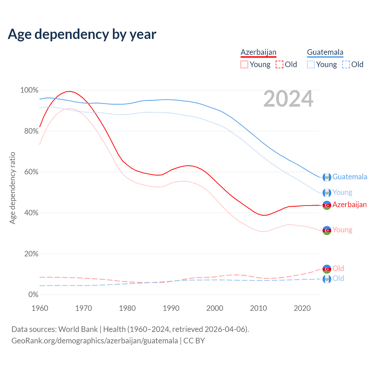 - Azerbaijan is ranked 82/196 by median age (oldest to youngest) vs 137/196 for Guatemala.