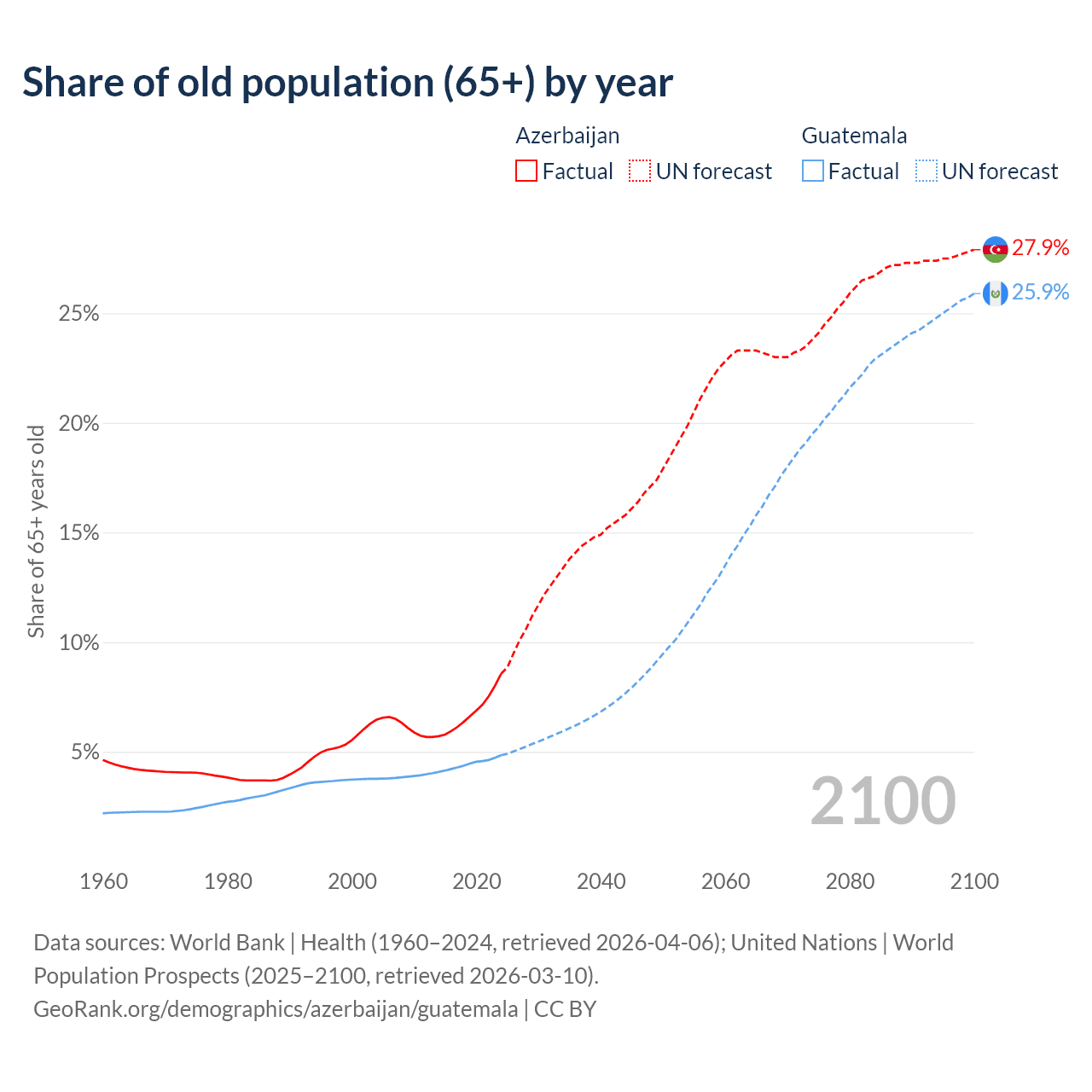 - The share of old-age demographic (65+) in Azerbaijan is 8.56% vs 4.85% in Guatemala.