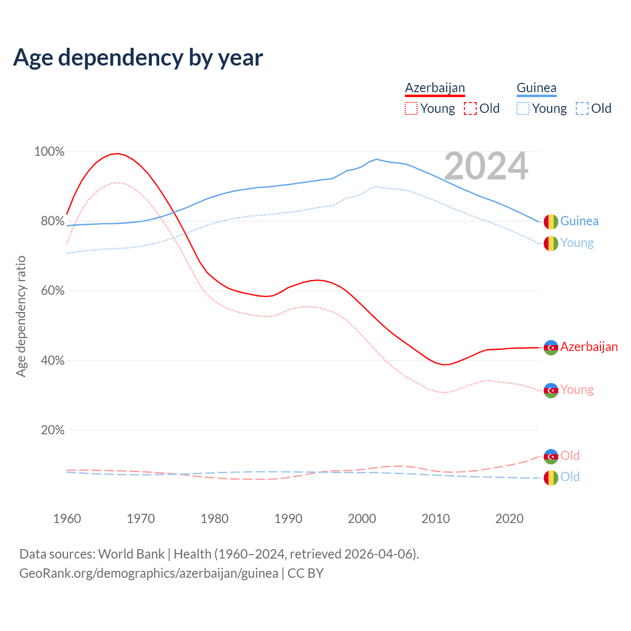 - Azerbaijan is ranked 82/196 by median age (oldest to youngest) vs 176/196 for Guinea.