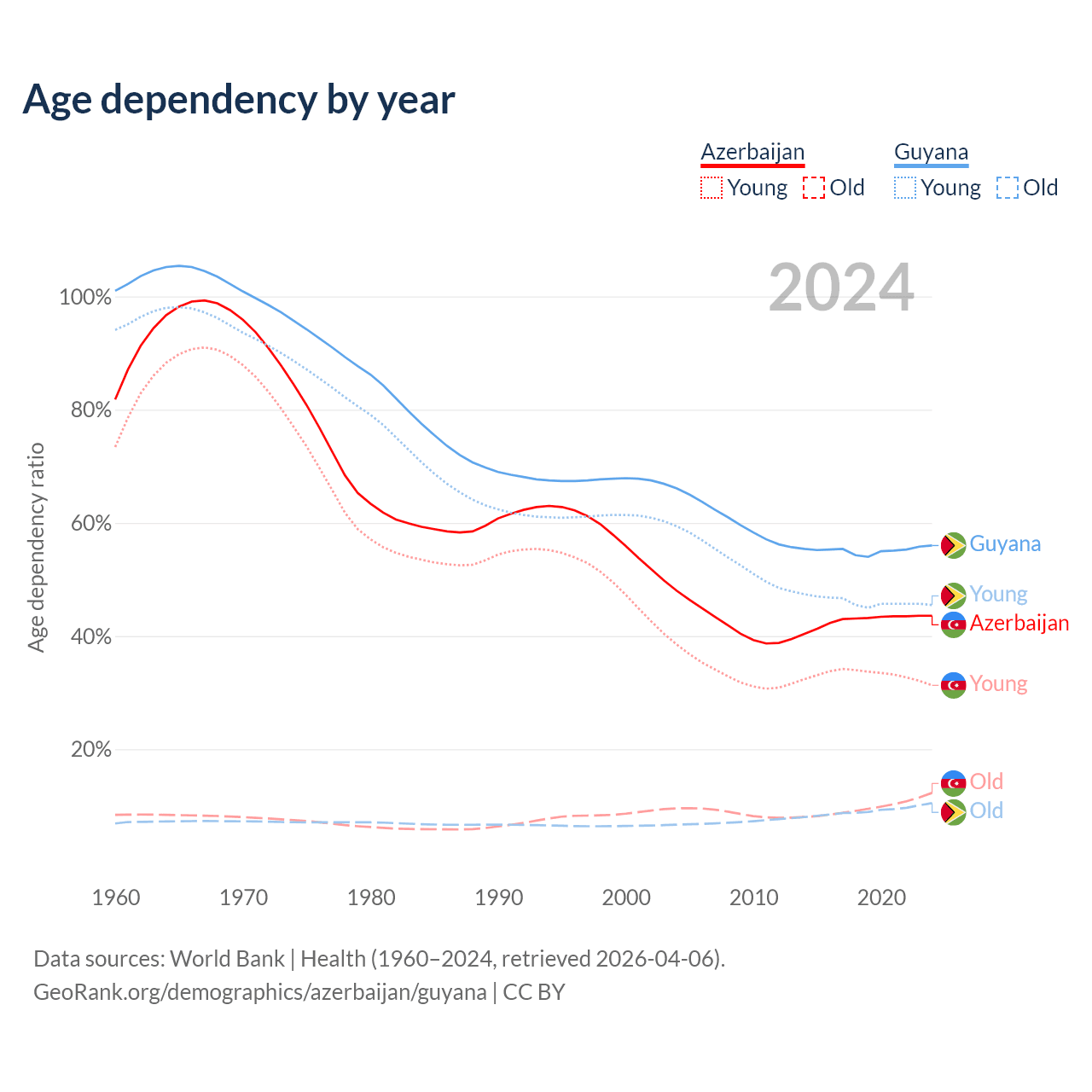 - Azerbaijan is ranked 82/196 by median age (oldest to youngest) vs 122/196 for Guyana.