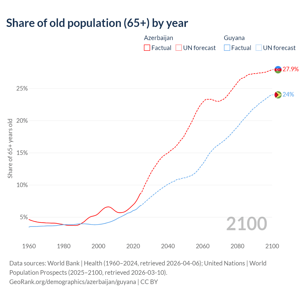 - The share of old-age demographic (65+) in Azerbaijan is 8.56% vs 6.73% in Guyana.