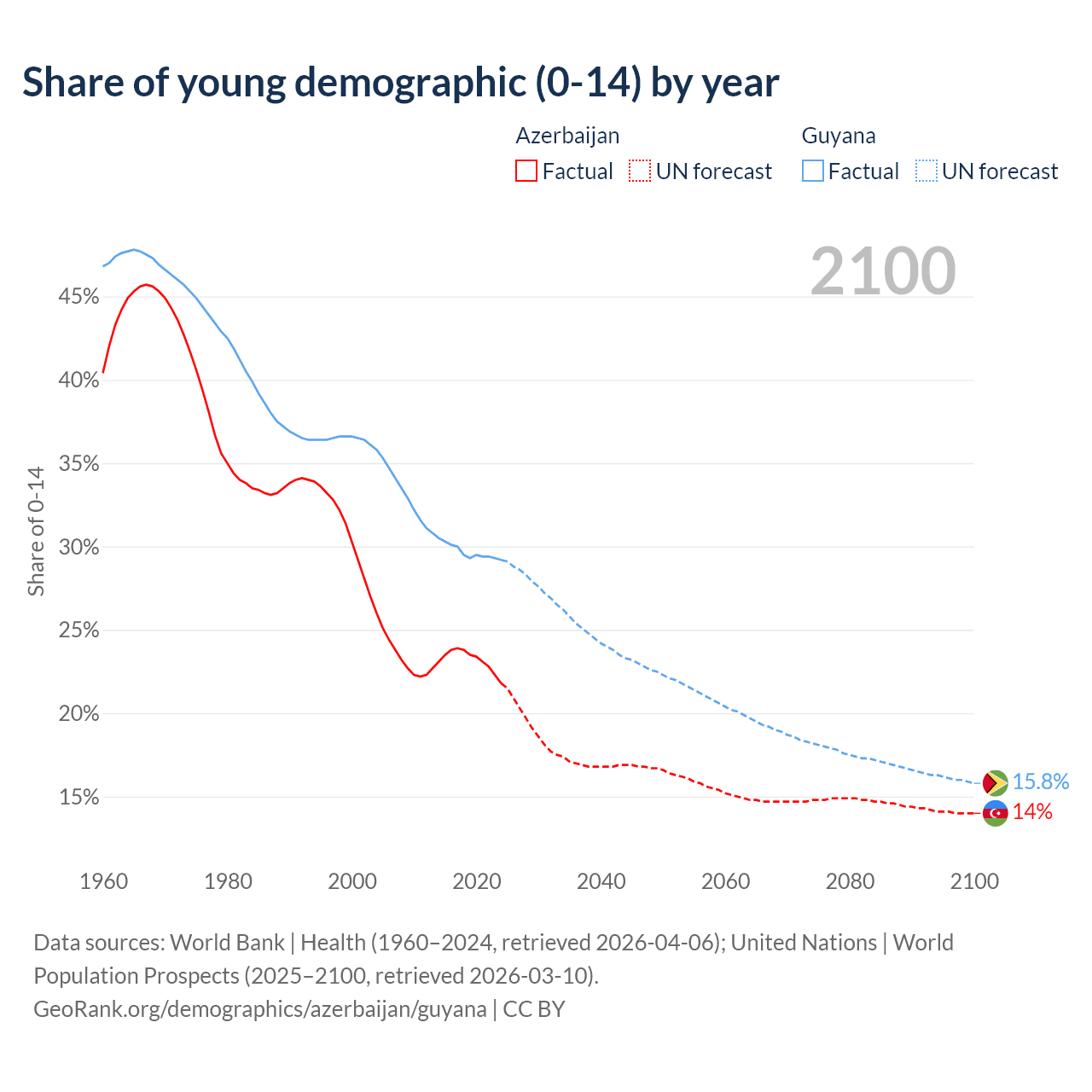 - The share of young demographic (0-15 years old) in Azerbaijan is 21.8% vs 29.2% in Guyana.