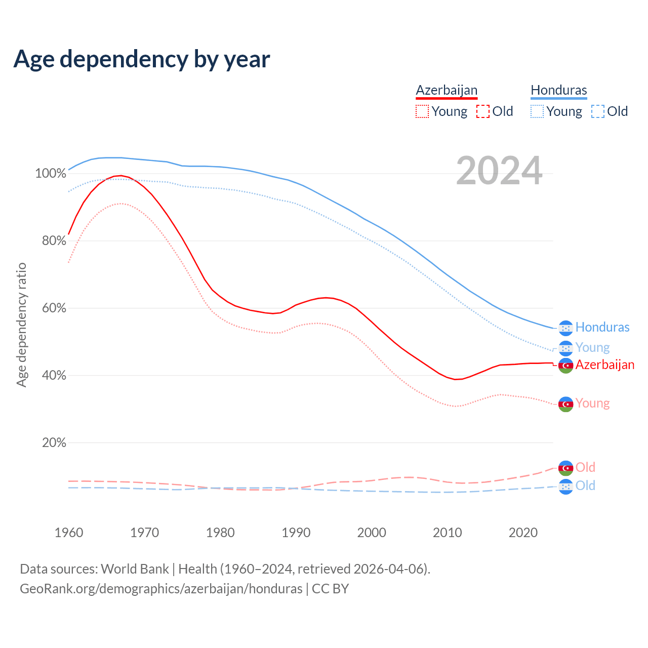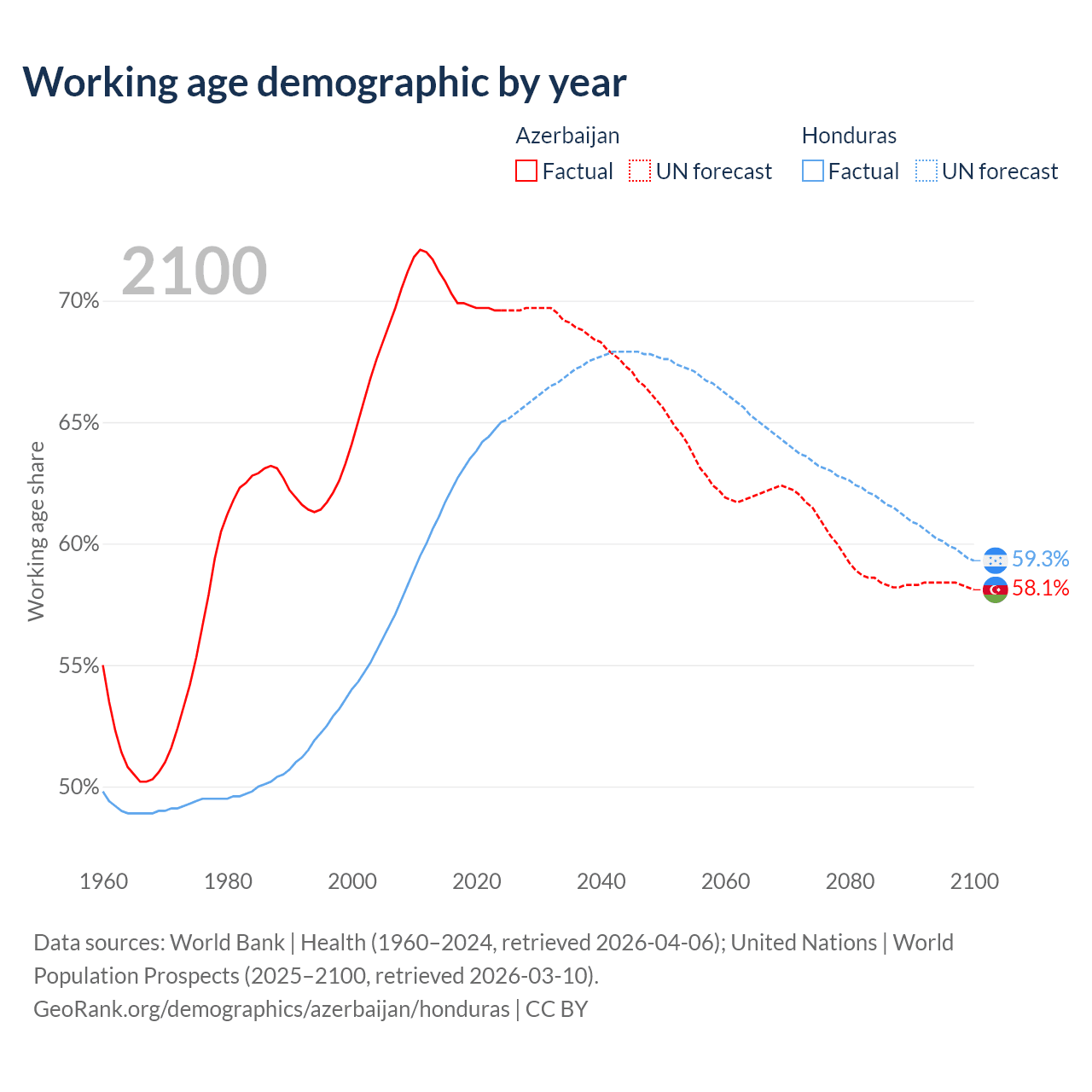 - Azerbaijan is ranked 82/196 by median age (oldest to youngest) vs 134/196 for Honduras.