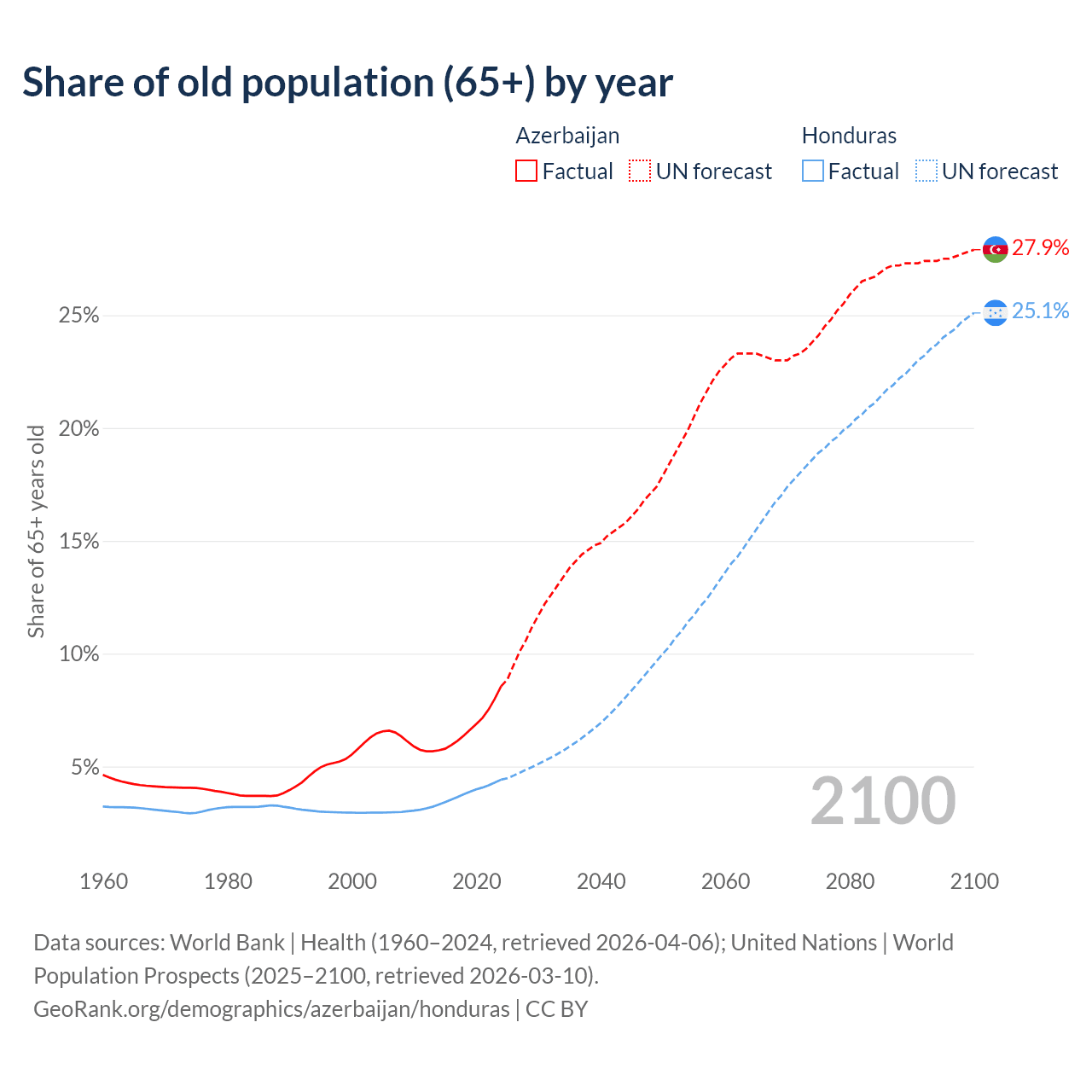 - The share of old-age demographic (65+) in Azerbaijan is 8.56% vs 4.42% in Honduras.