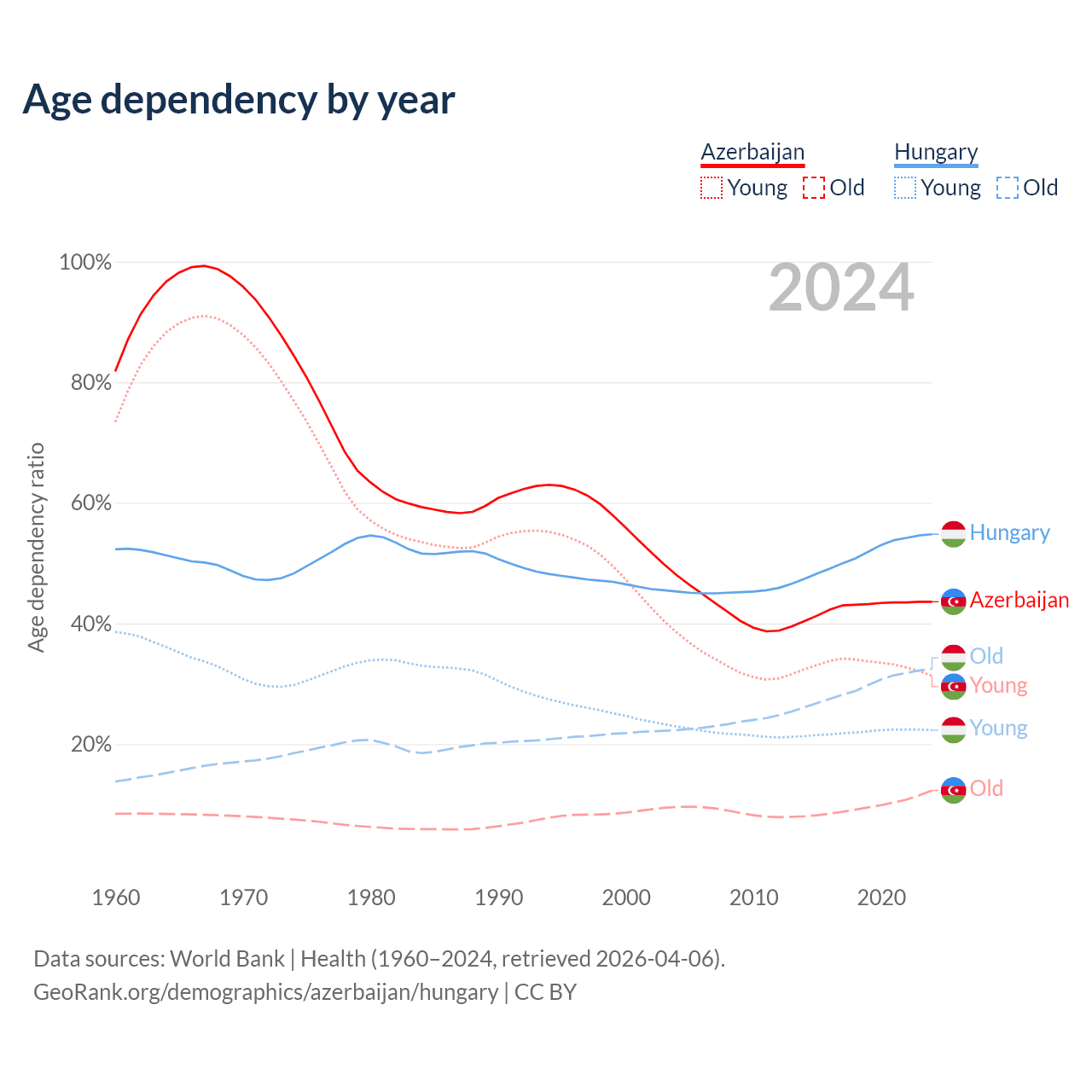 Data sources: World Bank | Health (1960–2024, retrieved 2026-04-06); U.S. Census Bureau (1960–2024, retrieved 2026-02-08).