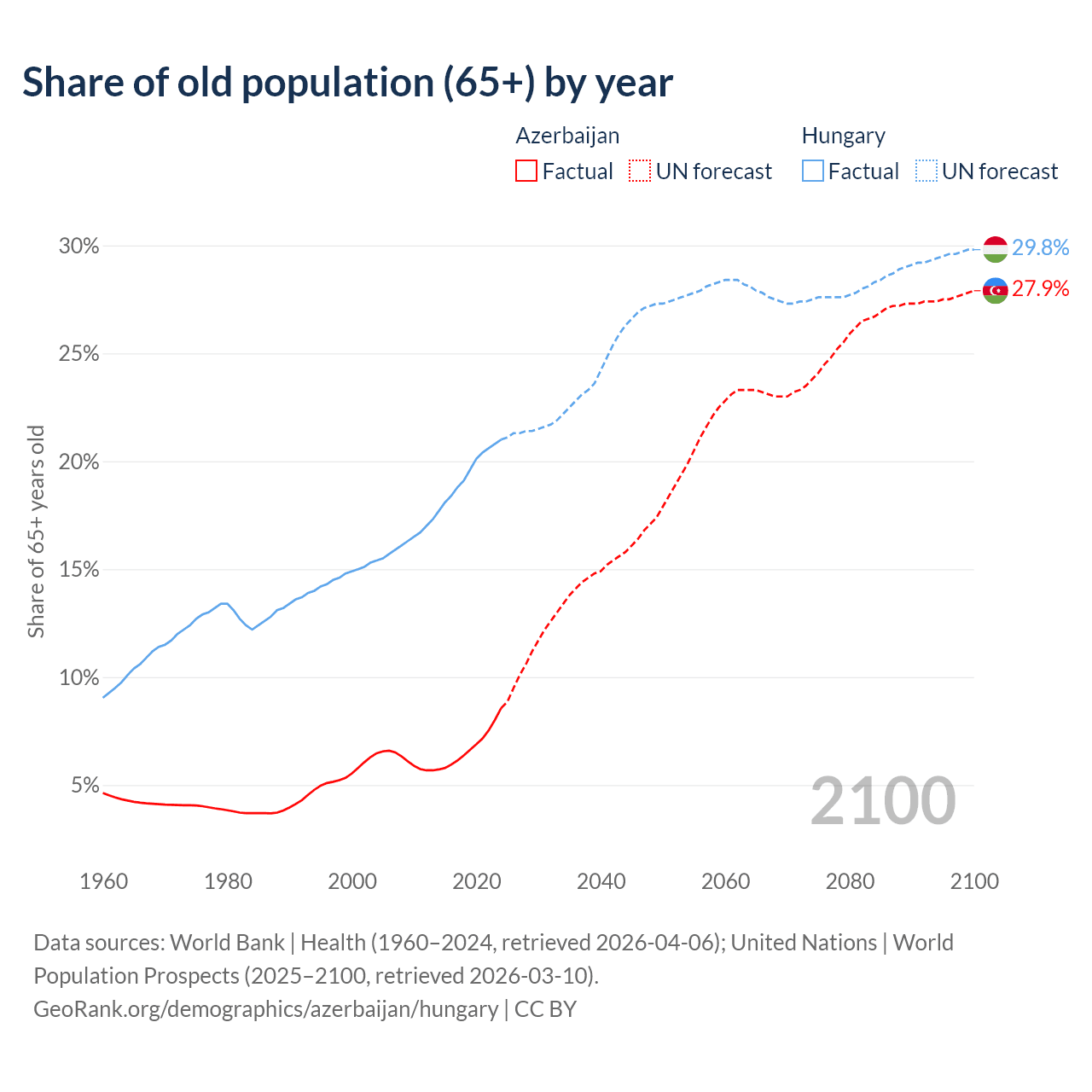 The share of older people aged 65 and over is 8.56% in Azerbaijan and 21% in Hungary. Life expectancy in Azerbaijan compared to Hungary .