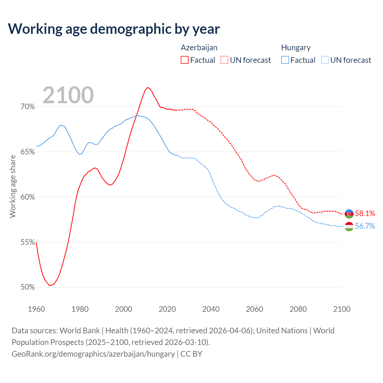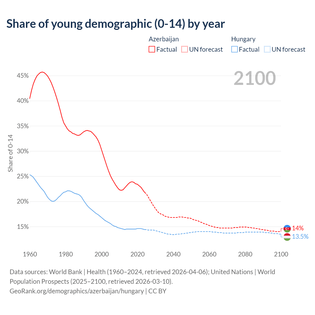 Median age Azerbaijan vs Hungary, 1960-2100