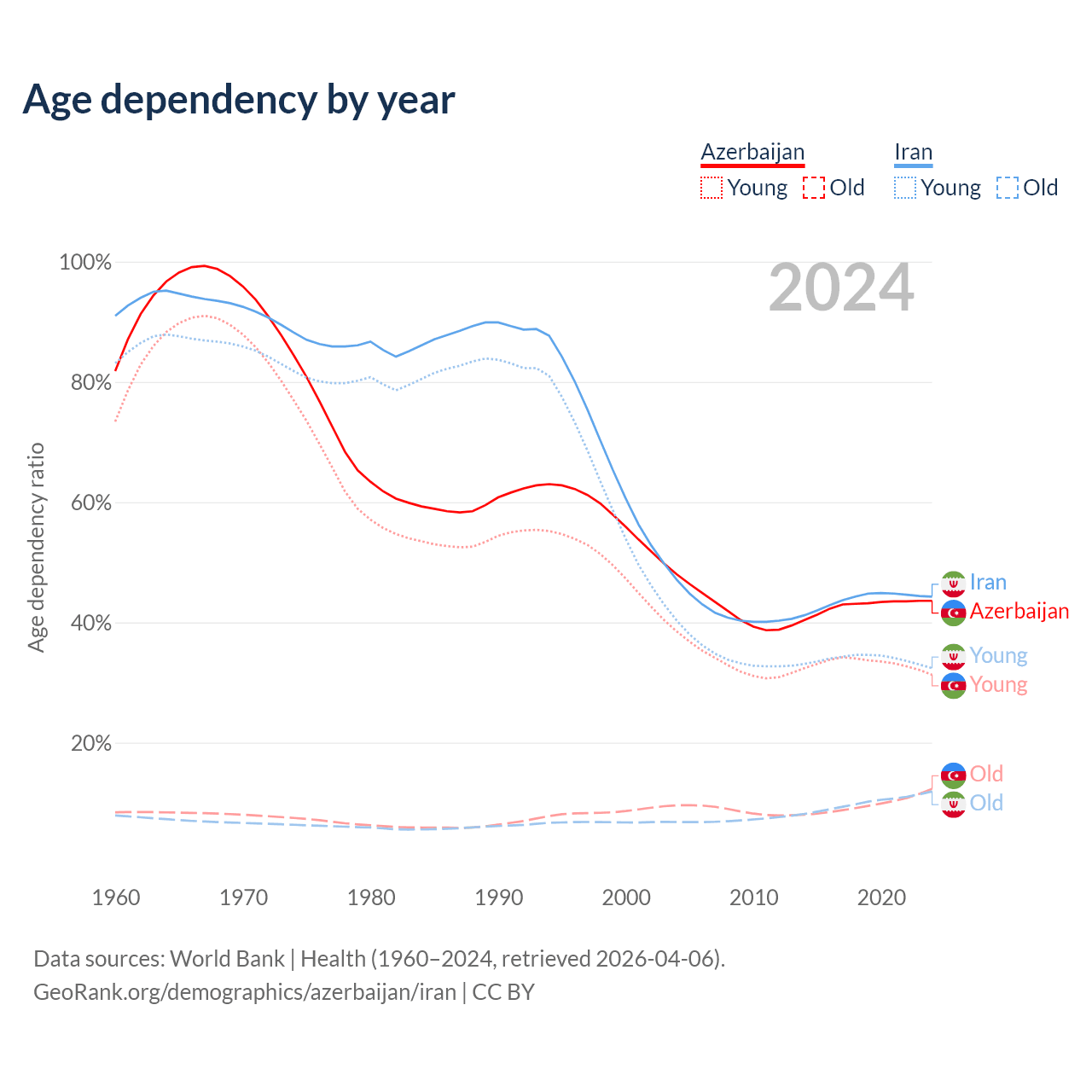 - The share of old-age demographic (65+) in Azerbaijan is 8.56% vs 8.24% in Iran.