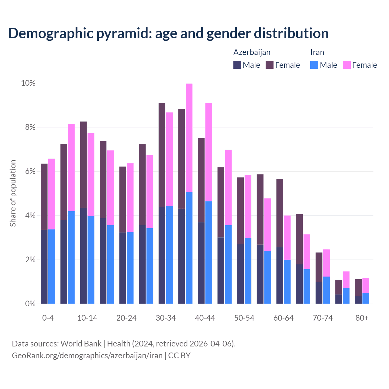 - Azerbaijan is ranked 82/196 by median age (oldest to youngest) vs 79/196 for Iran.