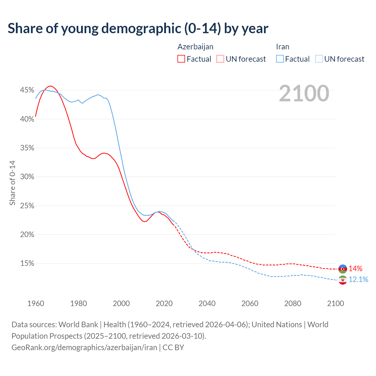 - The share of young demographic (0-15 years old) in Azerbaijan is 21.8% vs 22.4% in Iran.