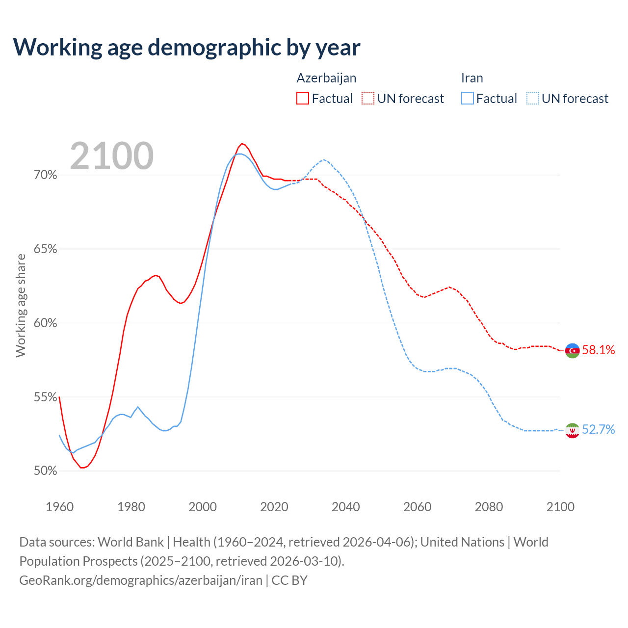- Azerbaijan has 7.2M working age adults (aged 15-64) vs 64.8M in Iran.