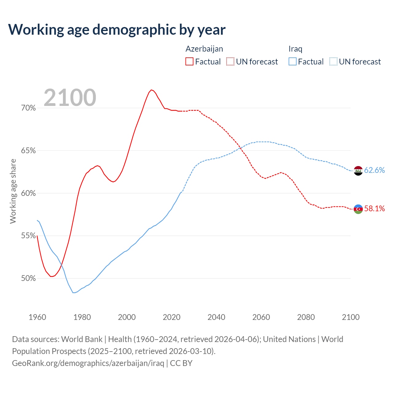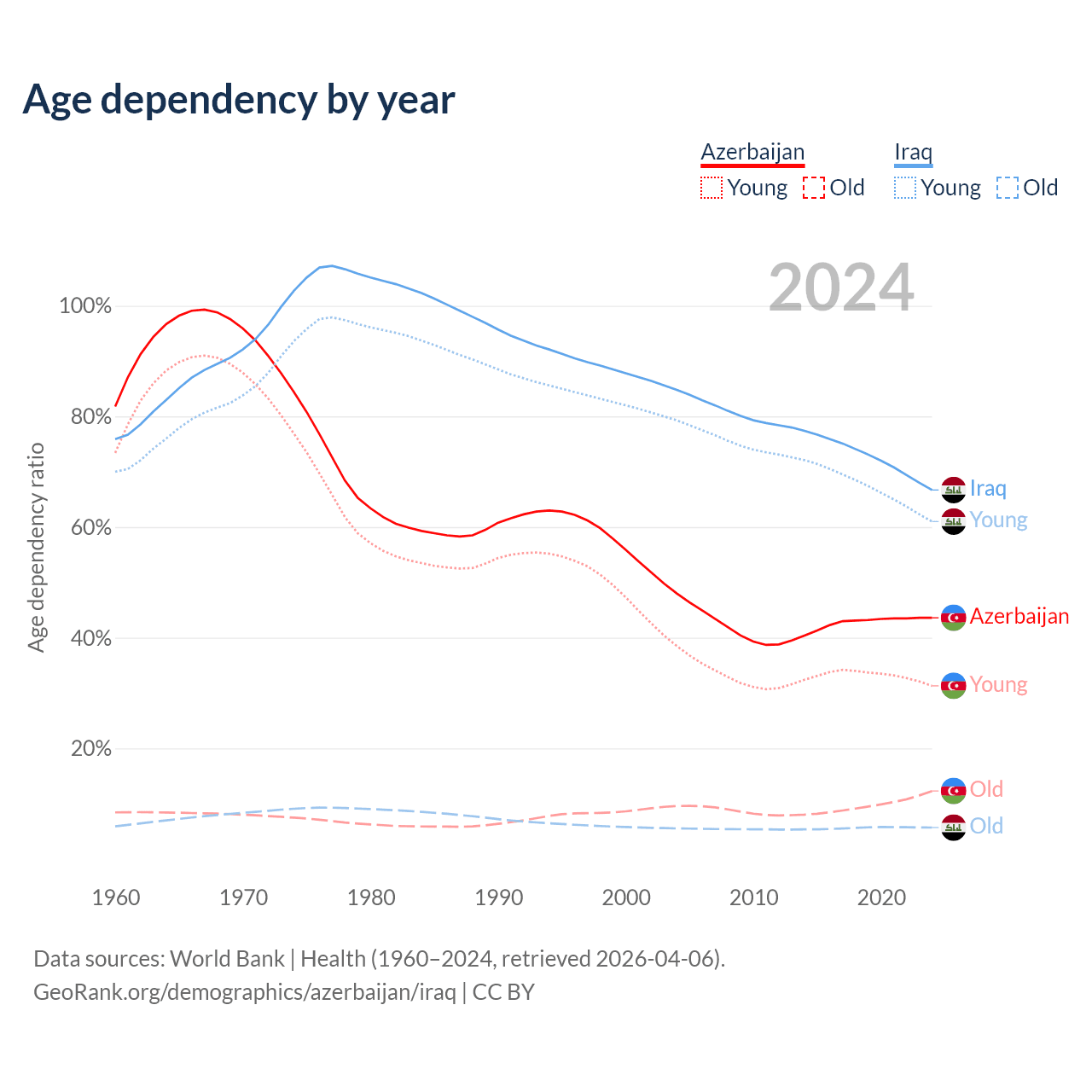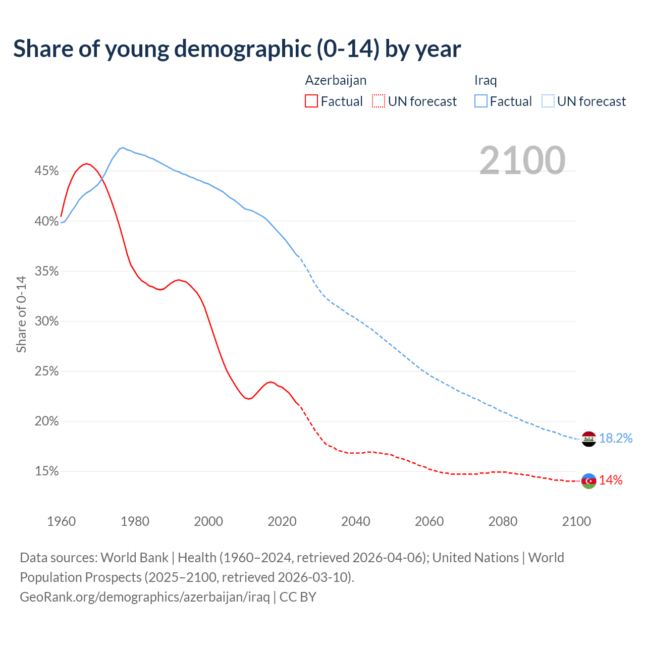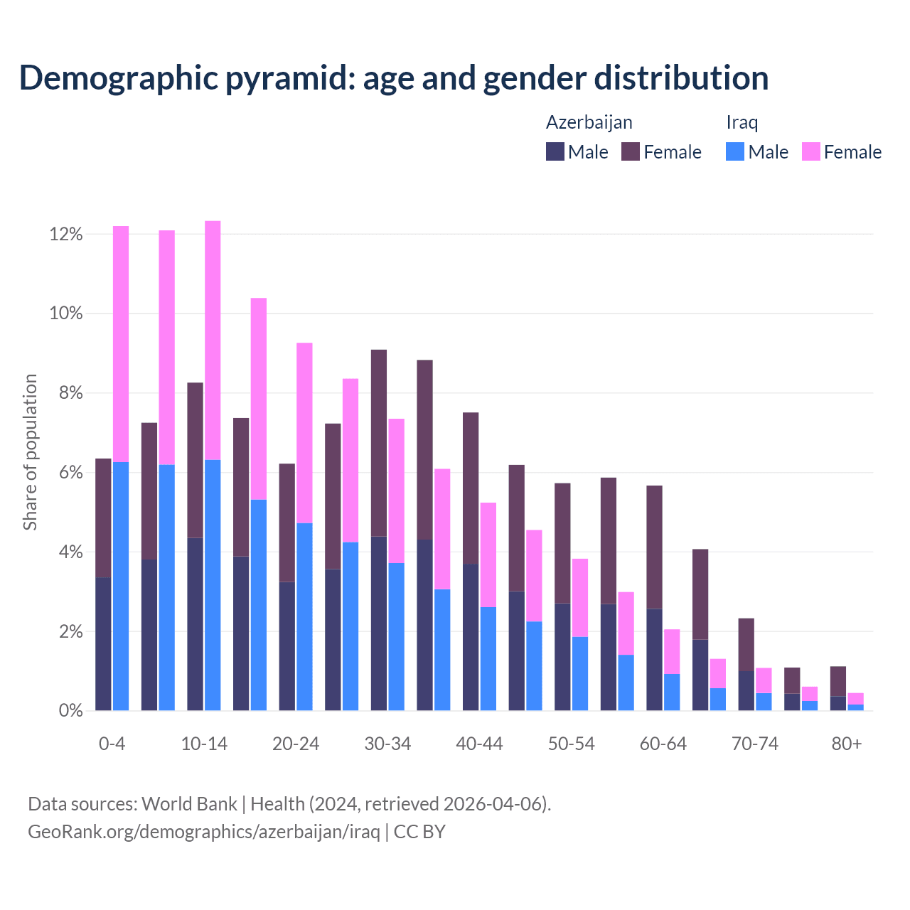 - Azerbaijan is ranked 82/196 by median age (oldest to youngest) vs 151/196 for Iraq.