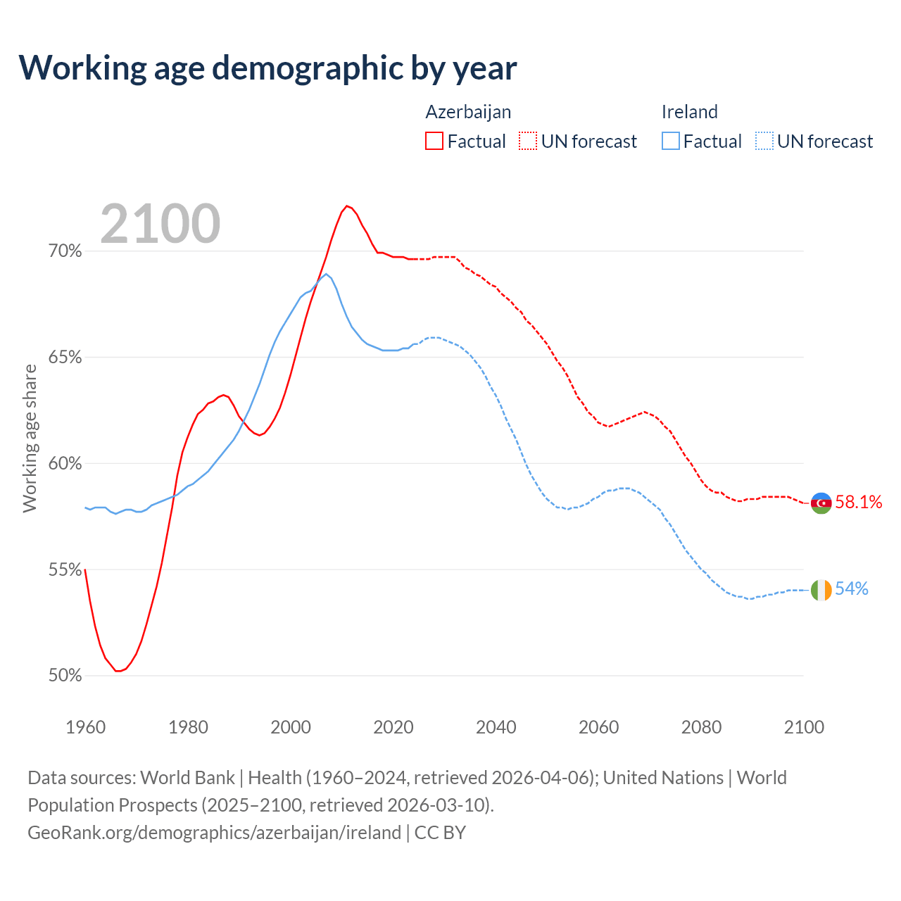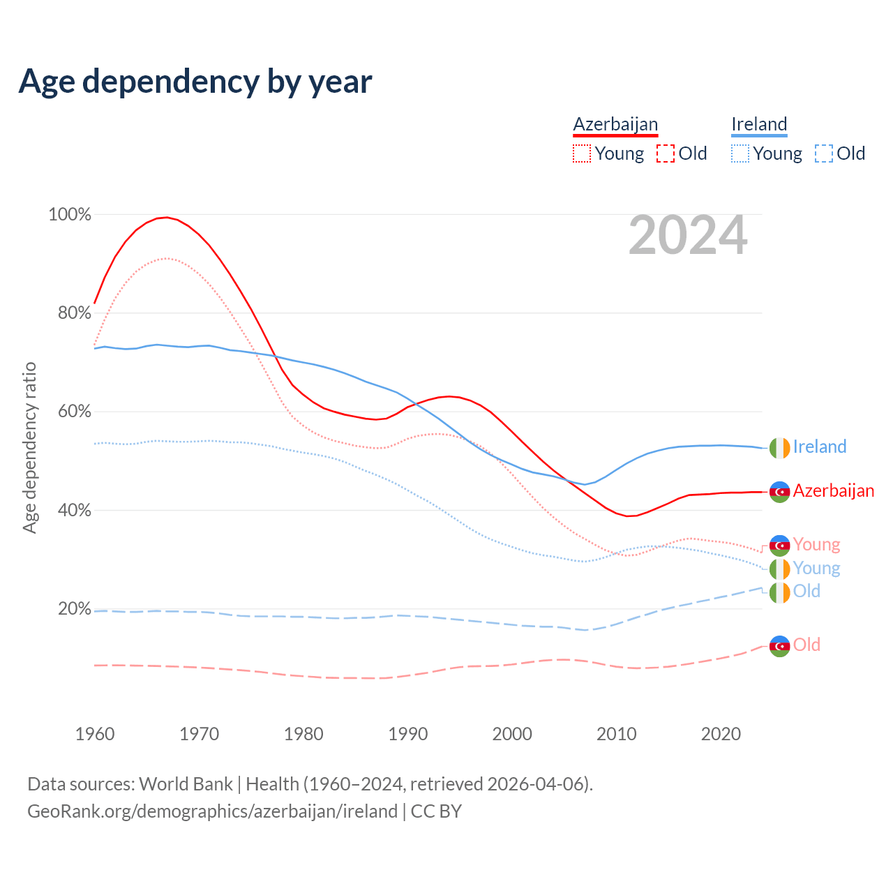 - Azerbaijan is ranked 82/196 by median age (oldest to youngest) vs 48/196 for Ireland.