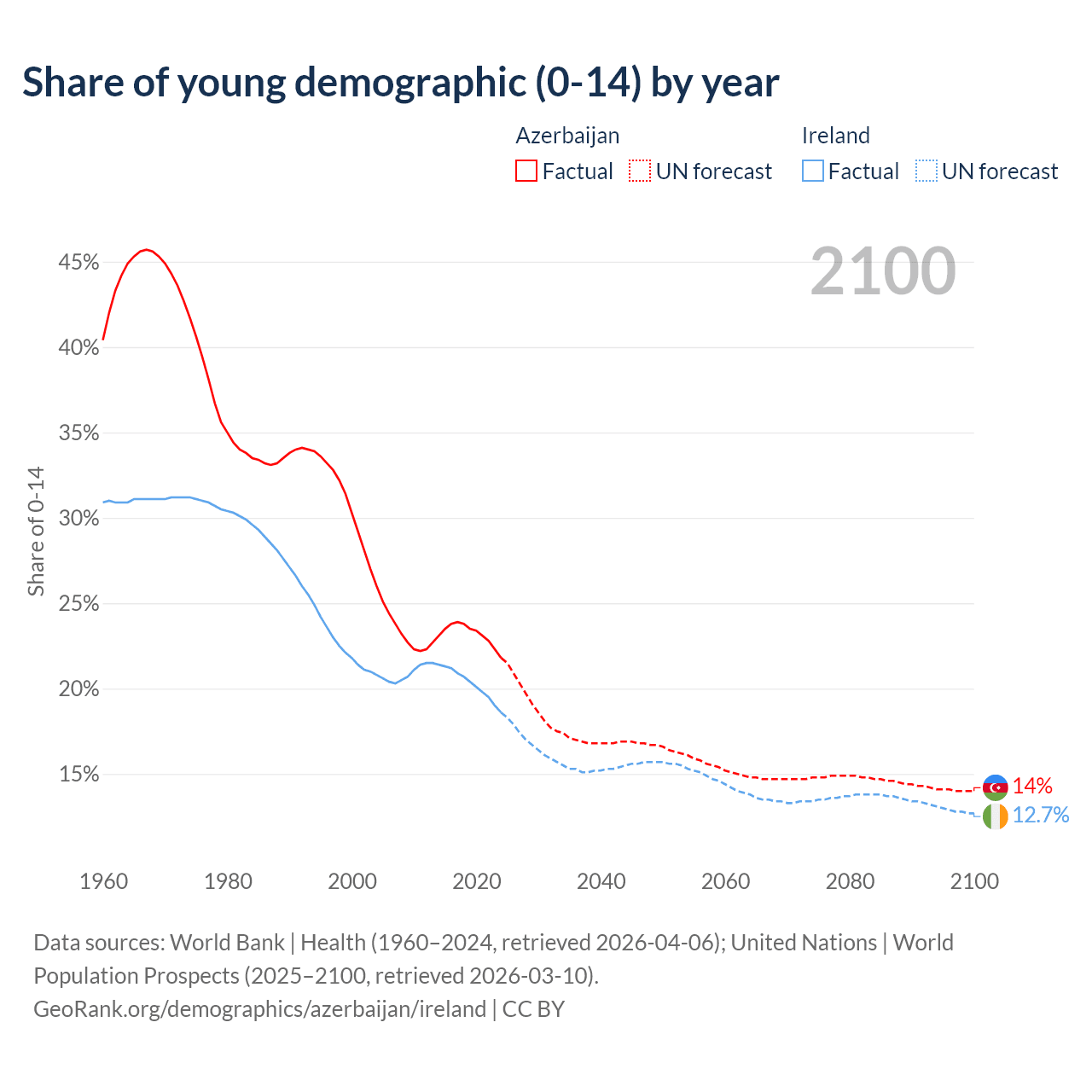 - The share of young demographic (0-15 years old) in Azerbaijan is 21.8% vs 18.6% in Ireland.