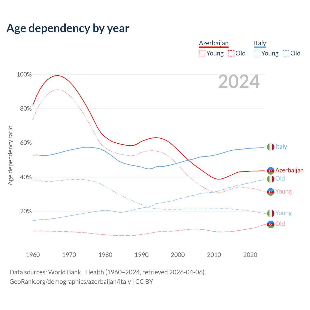 - Azerbaijan is ranked 82/196 by median age (oldest to youngest) vs 4/196 for Italy.