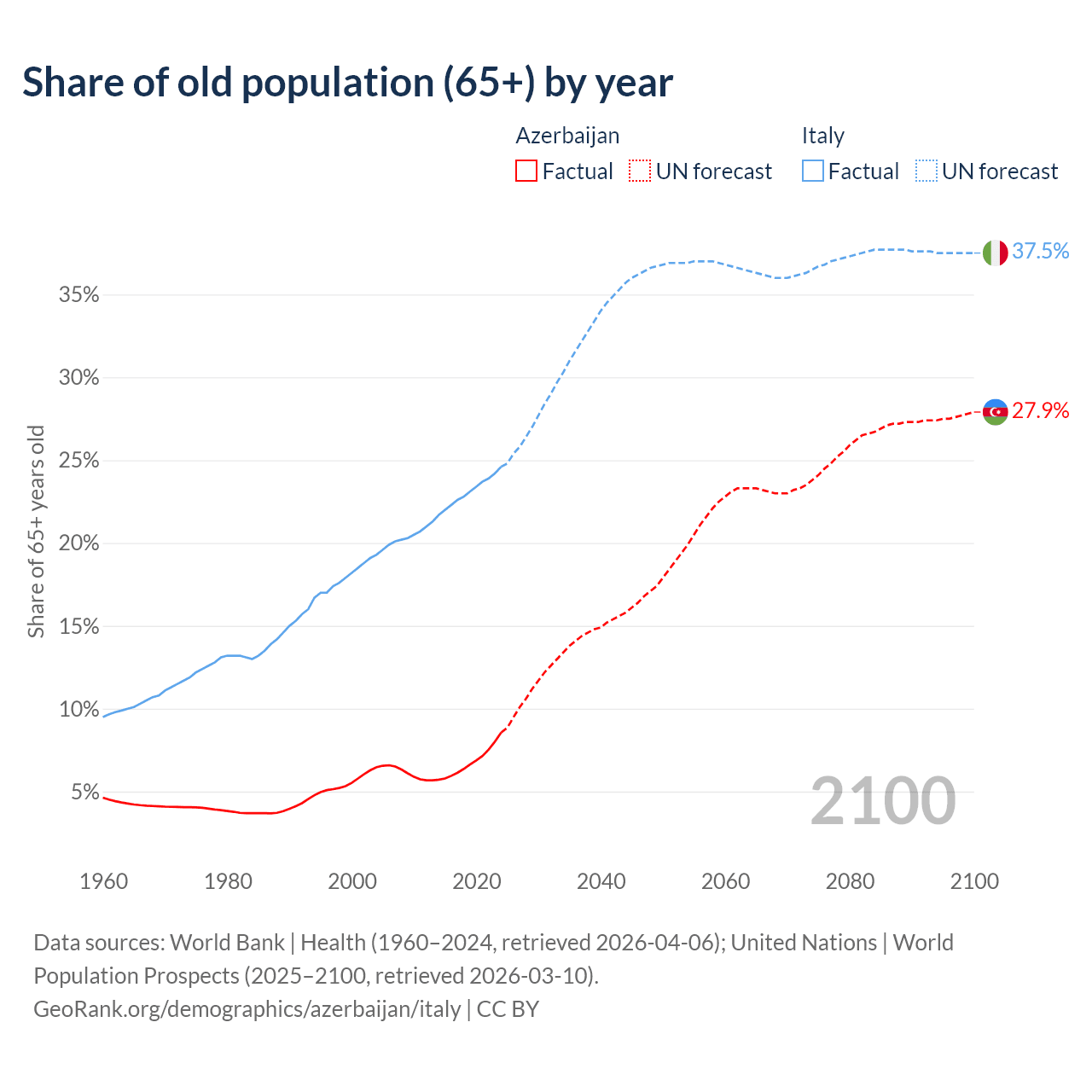 The share of older people aged 65 and over is 8.56% in Azerbaijan and 24.6% in Italy. Life expectancy in Azerbaijan compared to Italy .