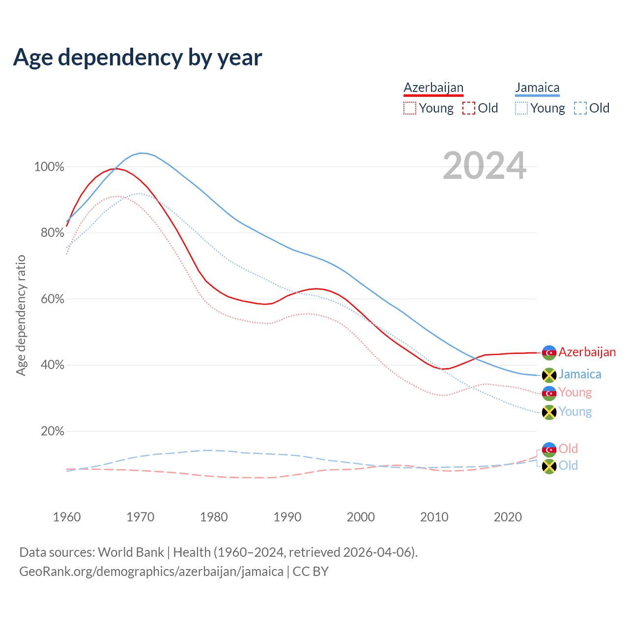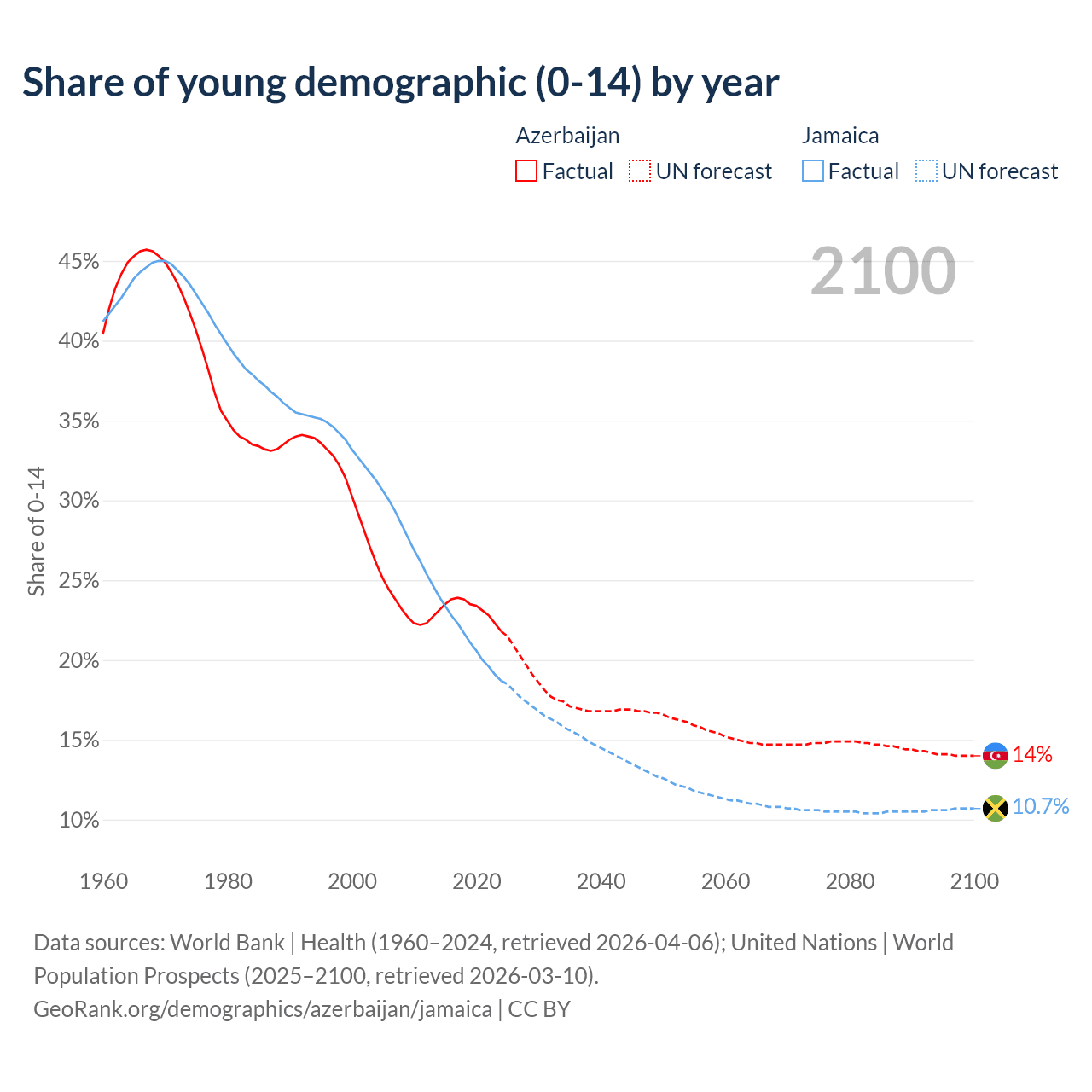 - The share of young demographic (0-15 years old) in Azerbaijan is 21.8% vs 18.7% in Jamaica.