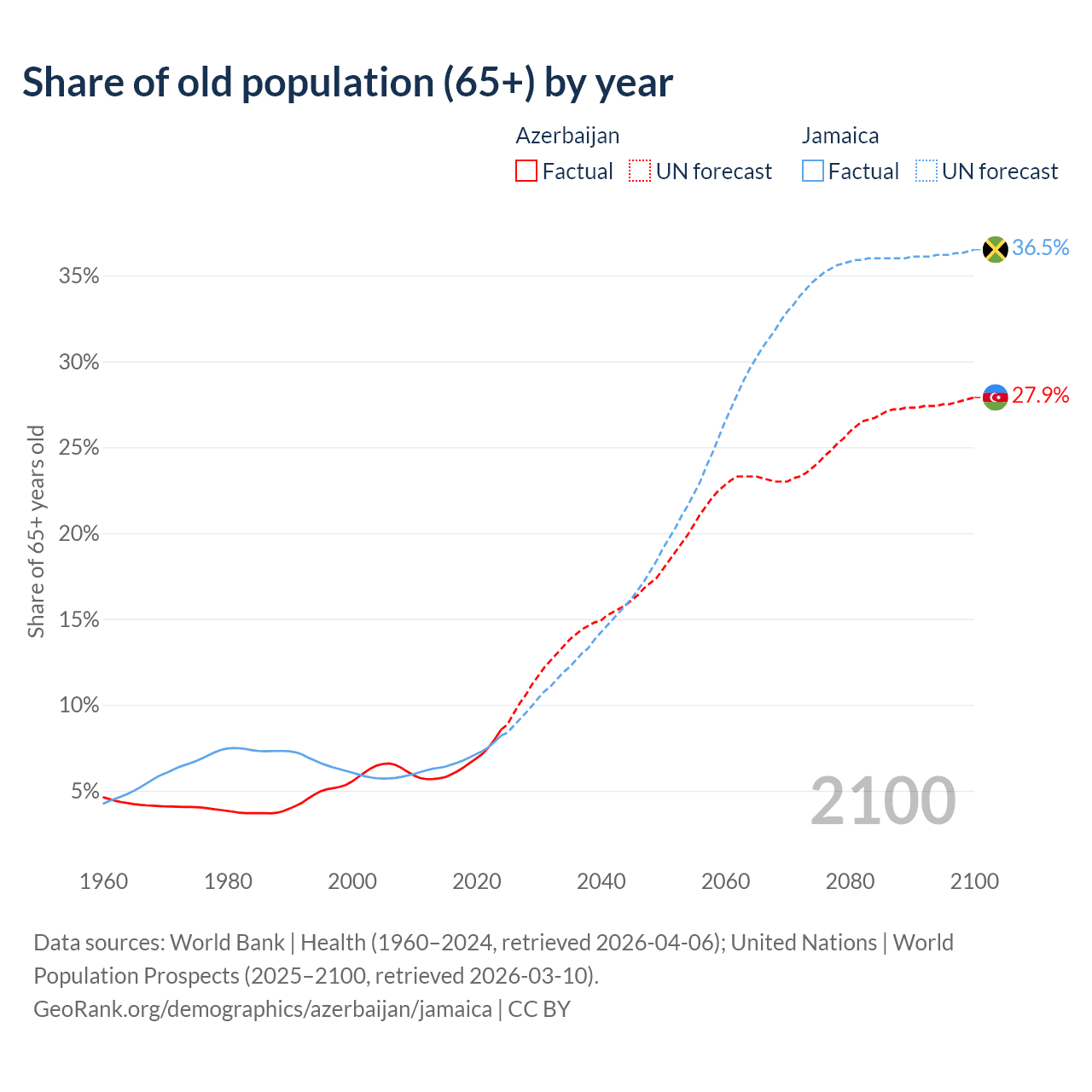 - The share of old-age demographic (65+) in Azerbaijan is 8.56% vs 8.21% in Jamaica.