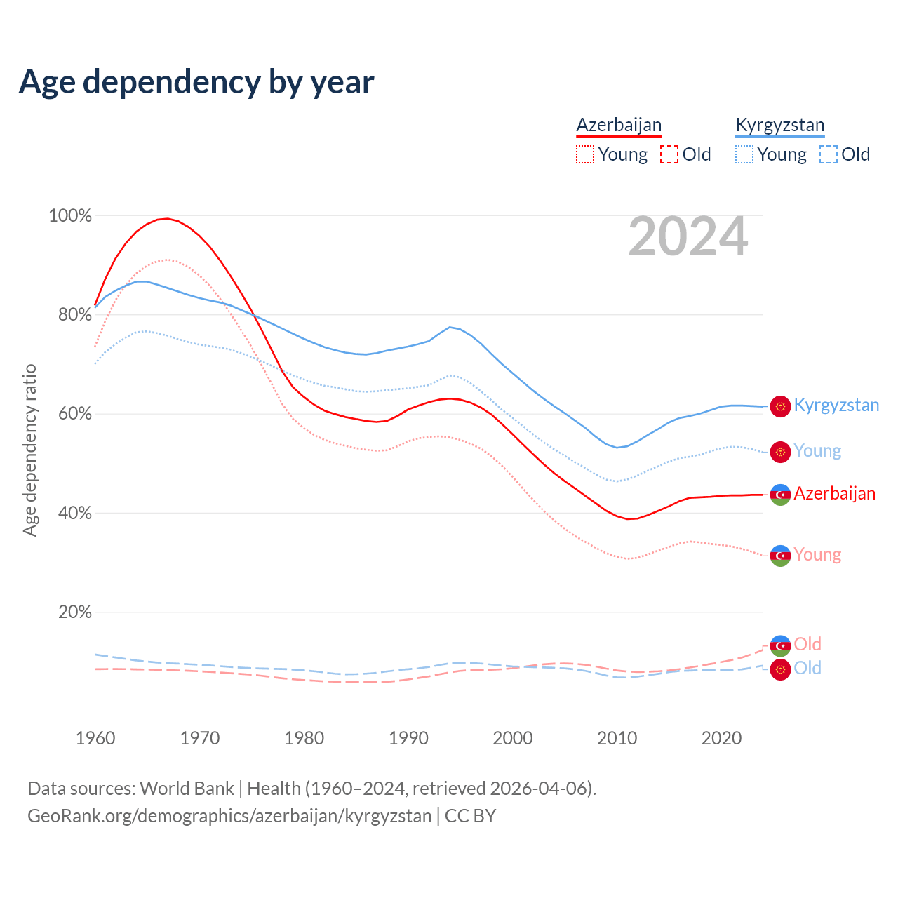 Data sources: World Bank | Health (1960–2024, retrieved 2026-04-06); U.S. Census Bureau (1960–2024, retrieved 2026-02-08).