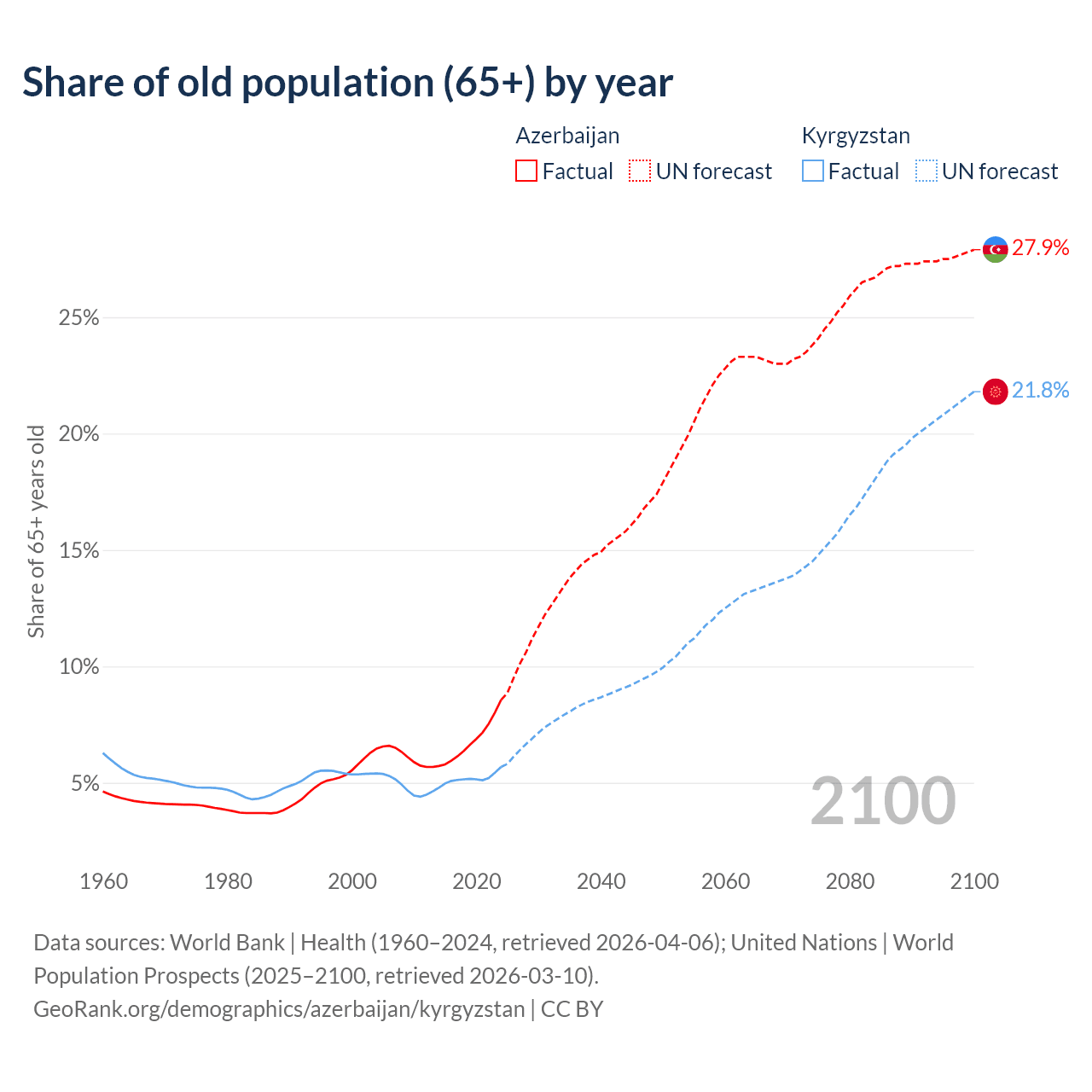 Median age Azerbaijan vs Kyrgyzstan, 1960-2100