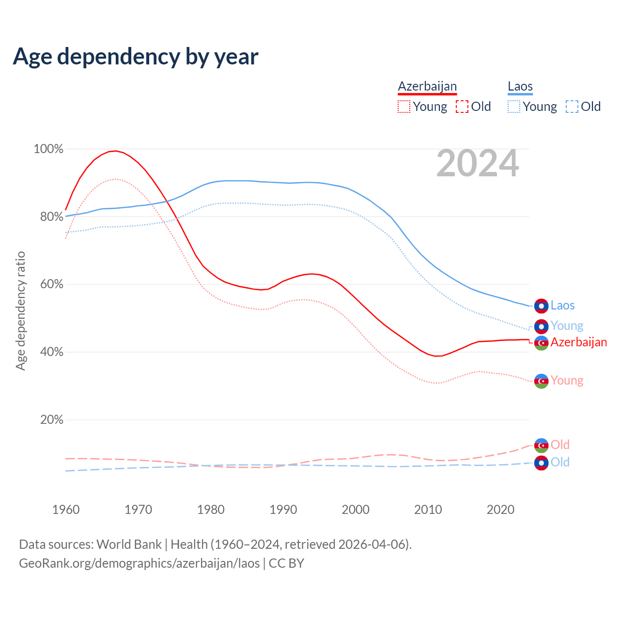 - Azerbaijan is ranked 82/196 by median age (oldest to youngest) vs 130/196 for Laos.