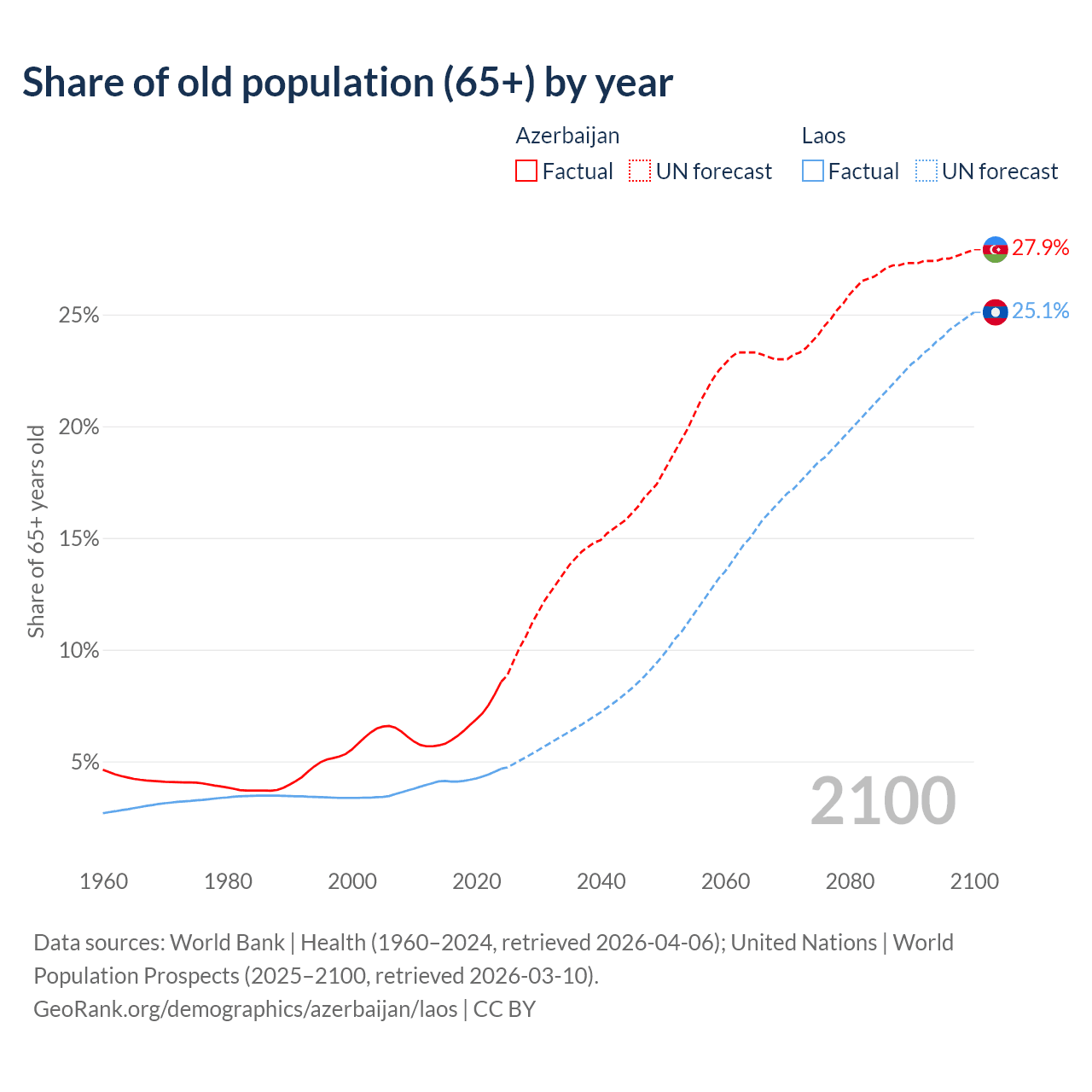 - The share of old-age demographic (65+) in Azerbaijan is 8.56% vs 4.67% in Laos.