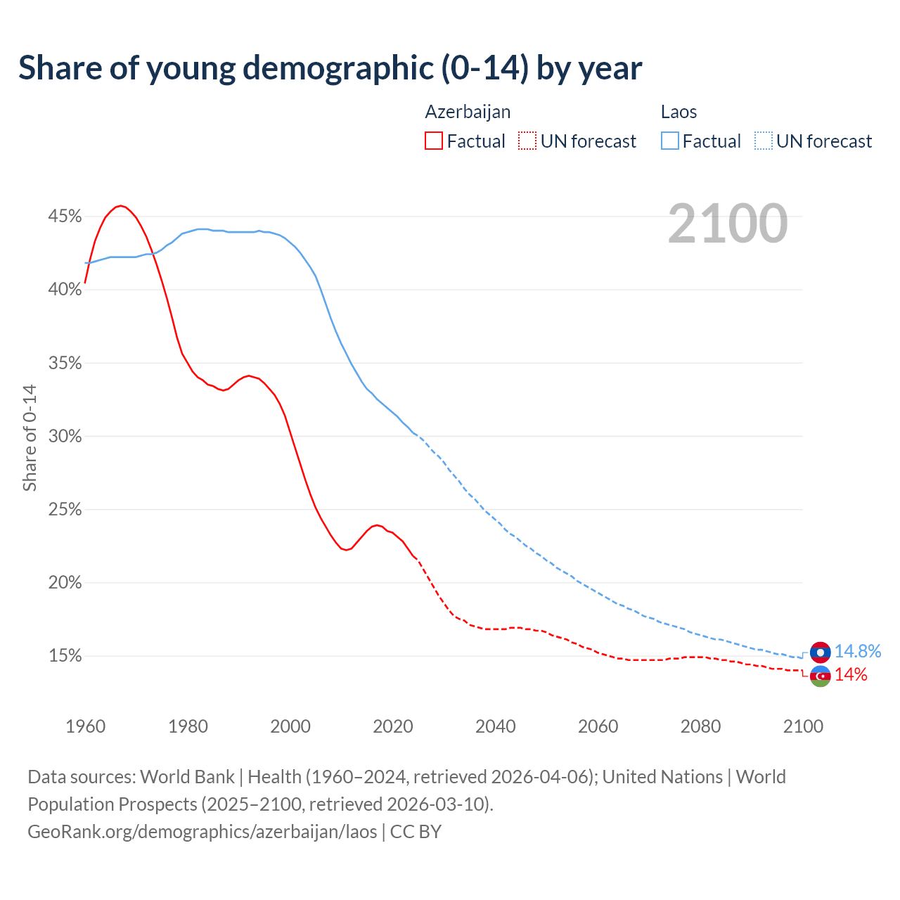 - The share of young demographic (0-15 years old) in Azerbaijan is 21.8% vs 30.2% in Laos.