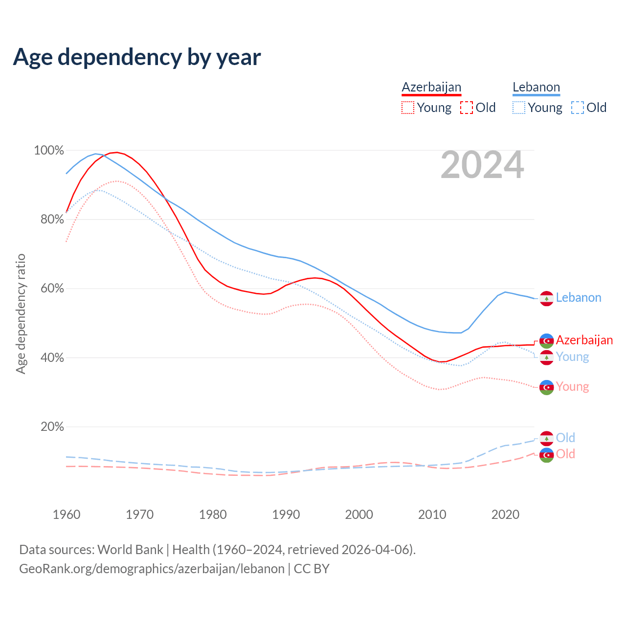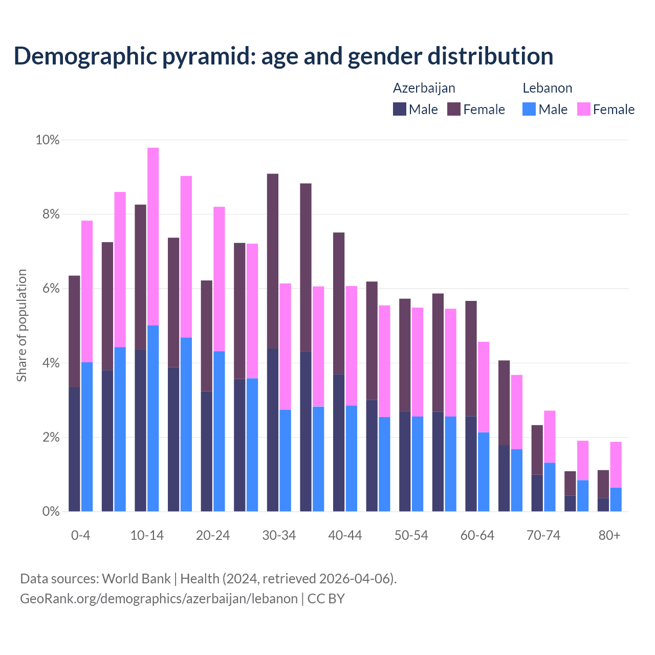 - Azerbaijan is ranked 82/196 by median age (oldest to youngest) vs 106/196 for Lebanon.