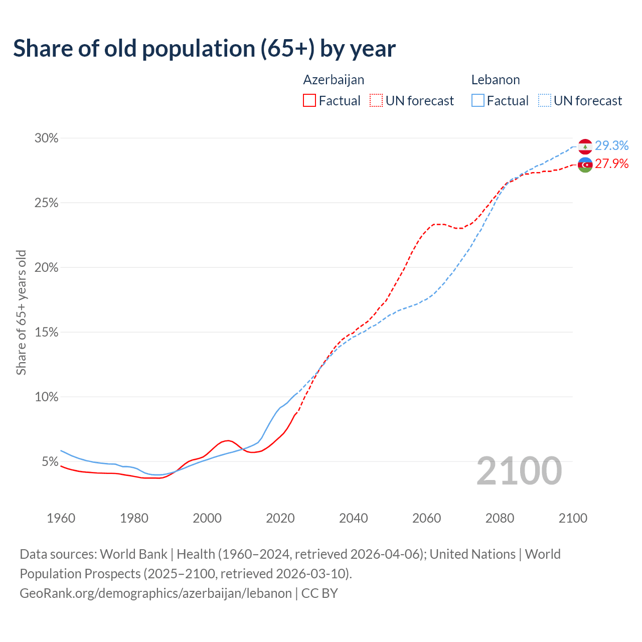 The share of older people aged 65 and over is 8.56% in Azerbaijan and 10.1% in Lebanon. Life expectancy in Azerbaijan compared to Lebanon .