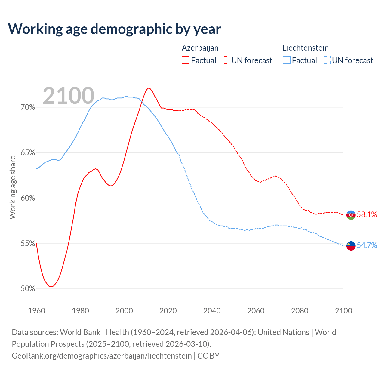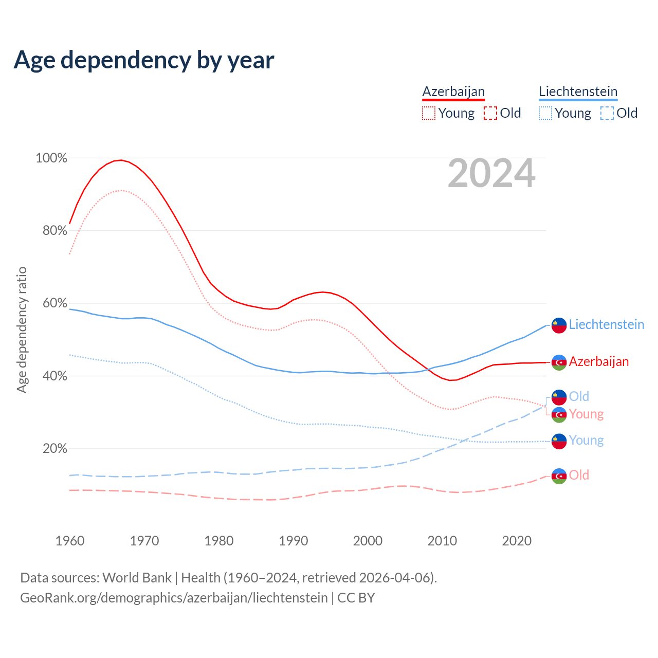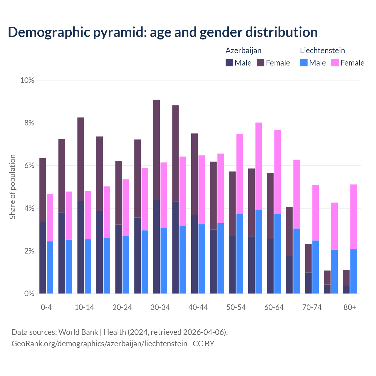 - The share of old-age demographic (65+) in Azerbaijan is 8.56% vs 20.7% in Liechtenstein.