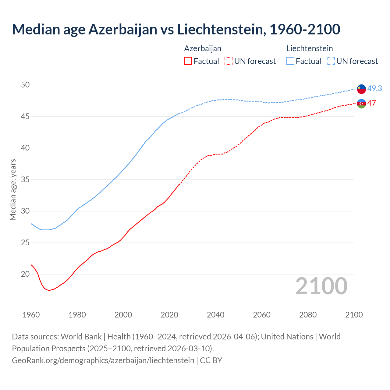 Median age Azerbaijan vs Liechtenstein, 1960-2100