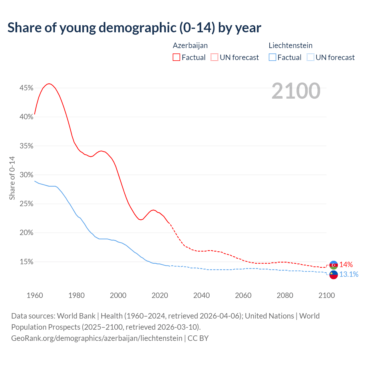 - The share of young demographic (0-15 years old) in Azerbaijan is 21.8% vs 14.3% in Liechtenstein.