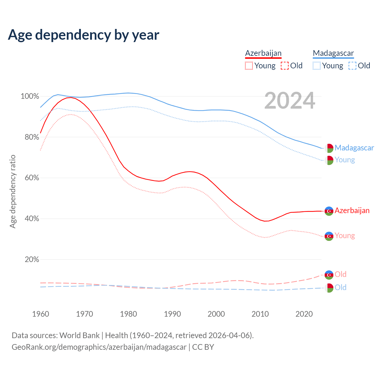 - The share of old-age demographic (65+) in Azerbaijan is 8.56% vs 3.41% in Madagascar.