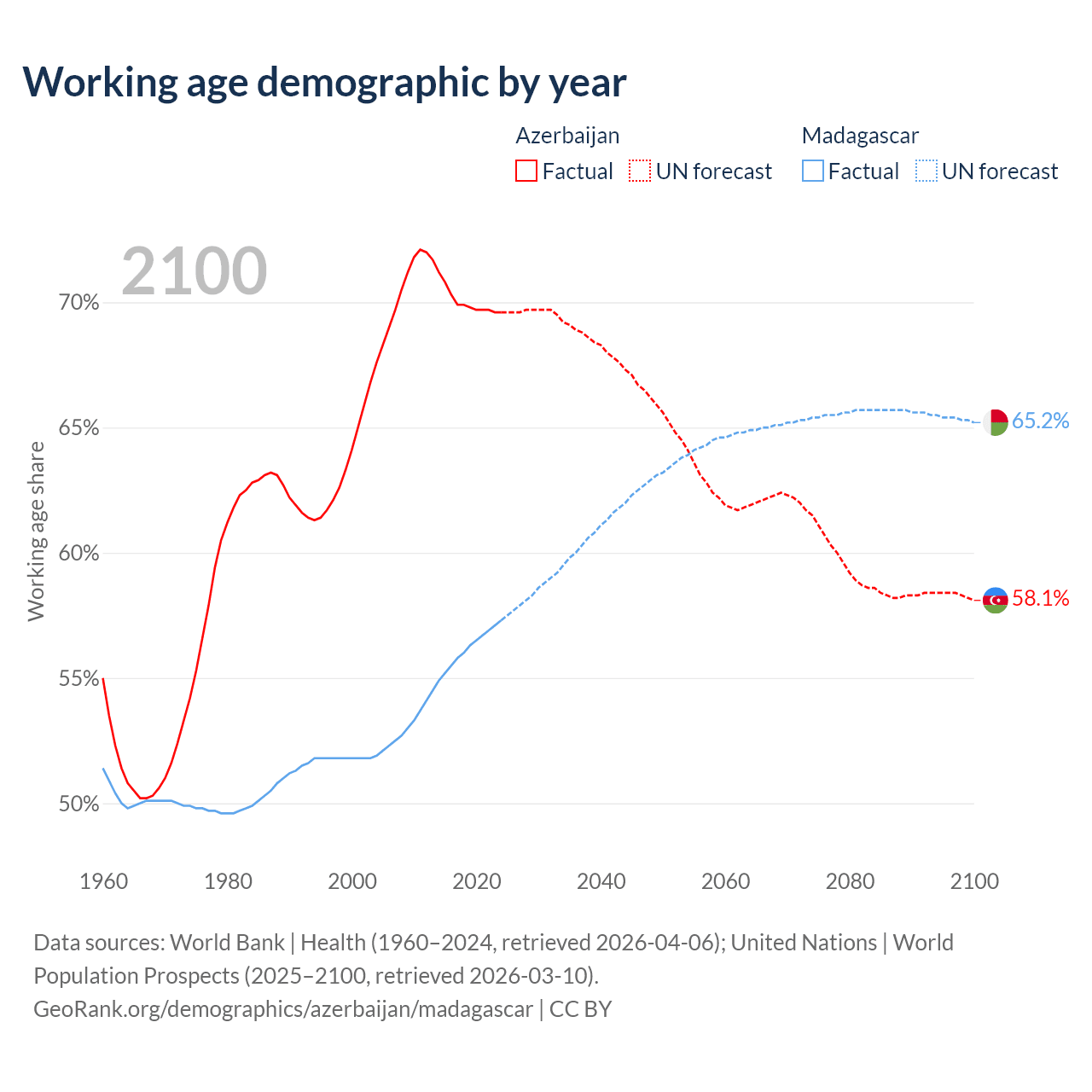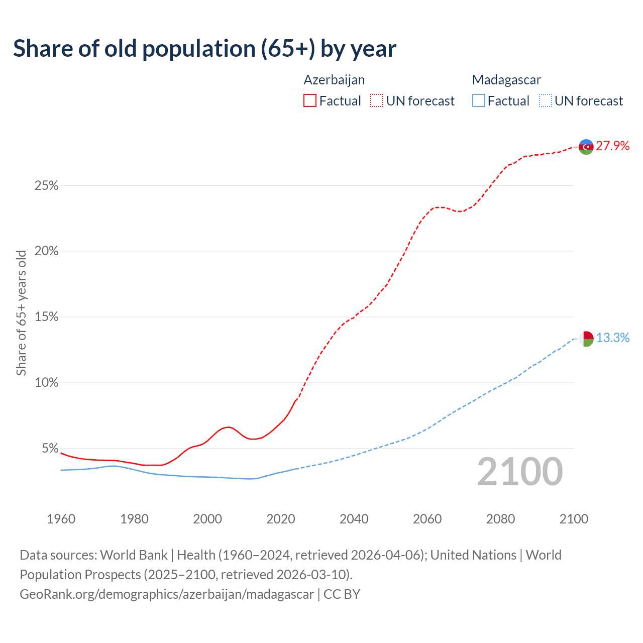 The share of older people aged 65 and over is 8.56% in Azerbaijan and 3.41% in Madagascar. Life expectancy in Azerbaijan compared to Madagascar .
