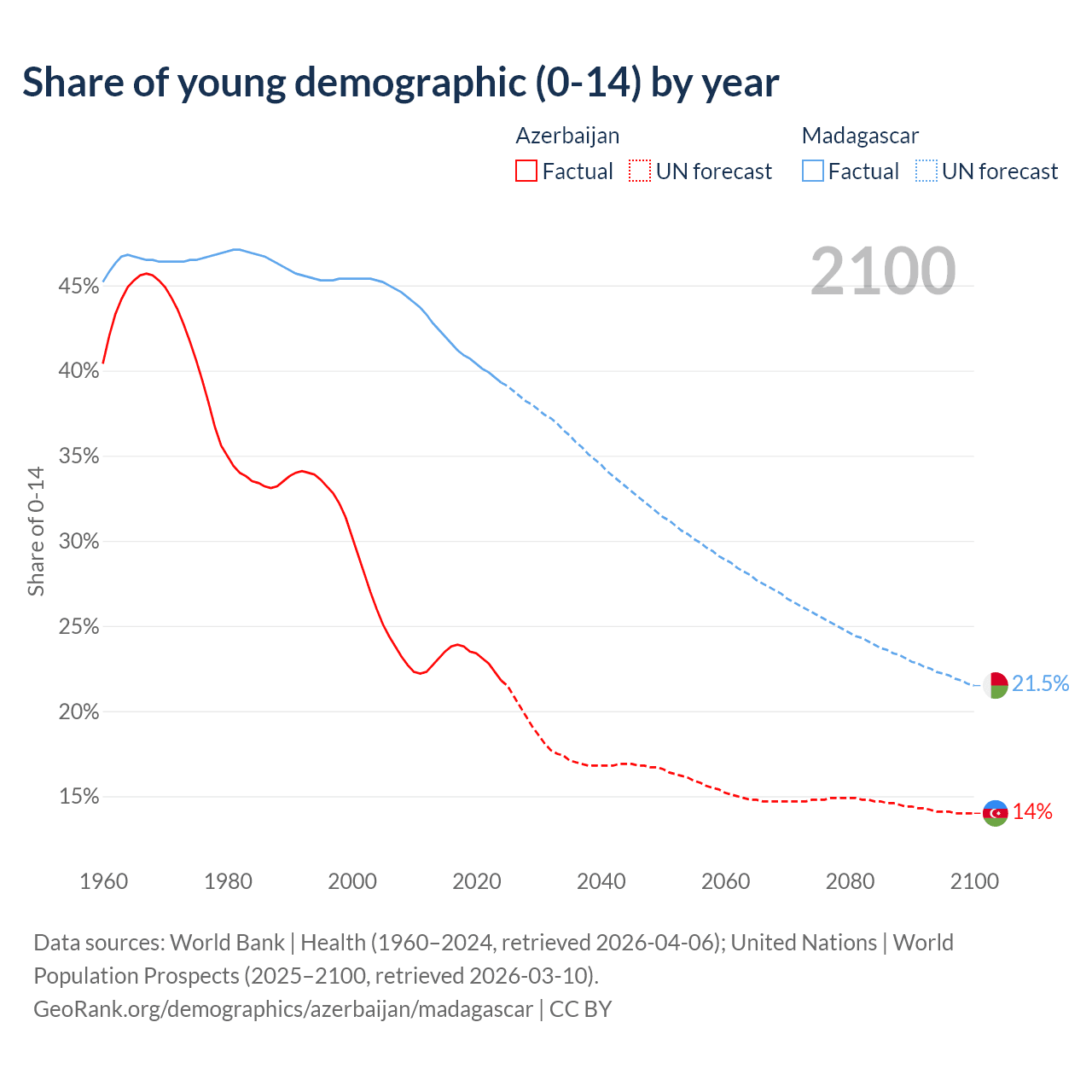 Median age Azerbaijan vs Madagascar, 1960-2100