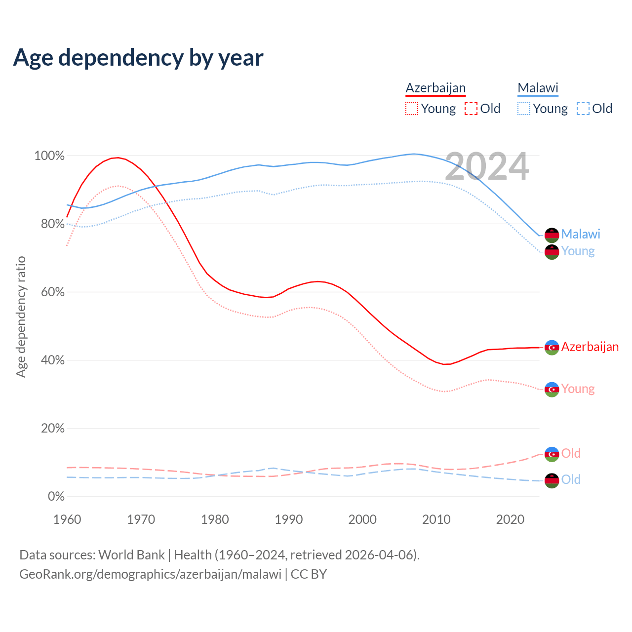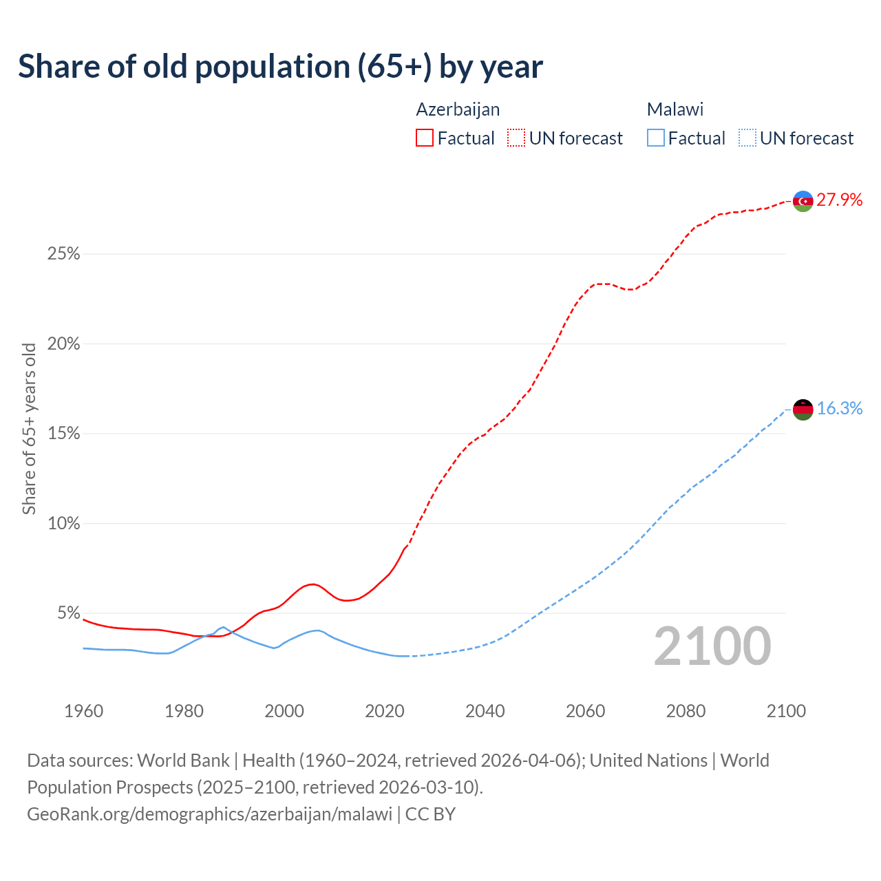 - The share of old-age demographic (65+) in Azerbaijan is 8.56% vs 2.59% in Malawi.