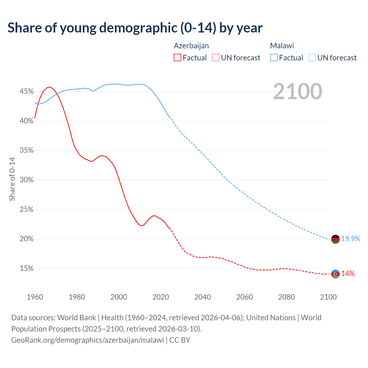 - The share of young demographic (0-15 years old) in Azerbaijan is 21.8% vs 40.7% in Malawi.