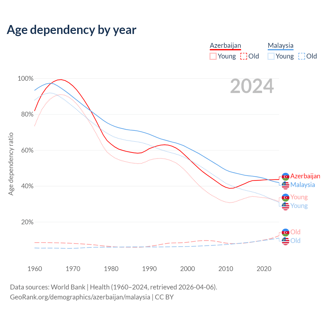 Data sources: World Bank | Health (1960–2024, retrieved 2026-04-06); U.S. Census Bureau (1960–2024, retrieved 2026-02-08).