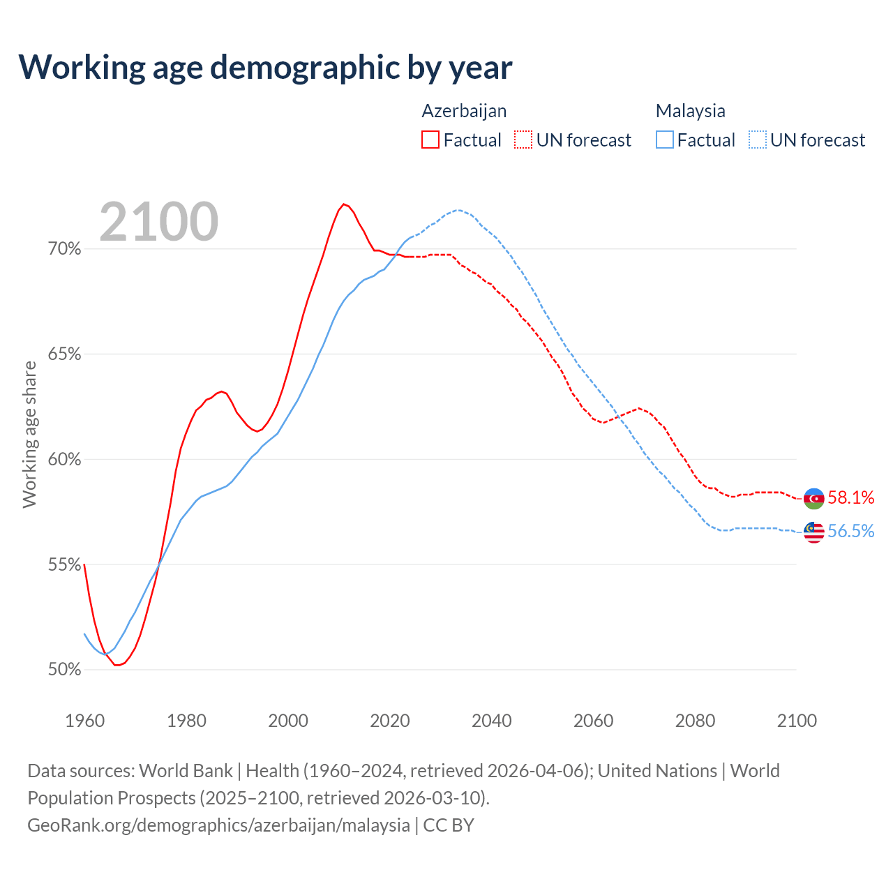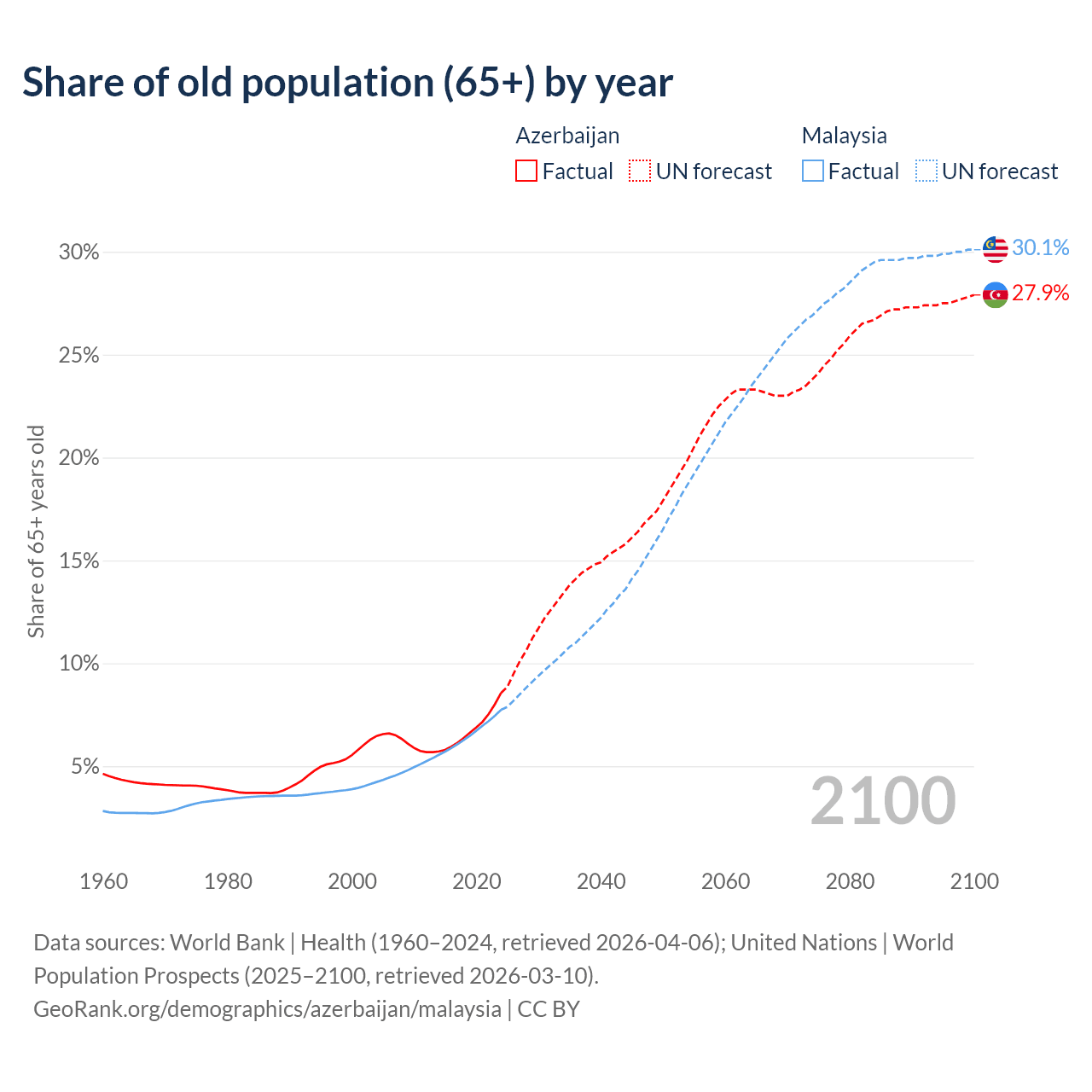 Median age Azerbaijan vs Malaysia, 1960-2100