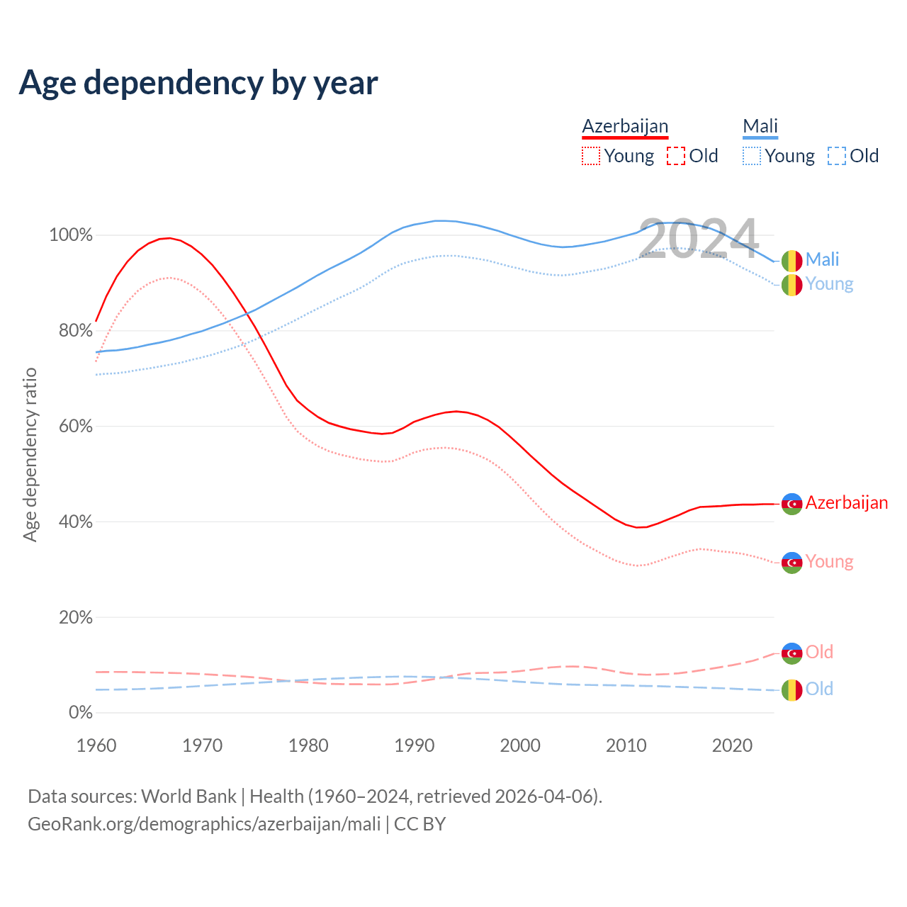 - Azerbaijan is ranked 82/196 by median age (oldest to youngest) vs 193/196 for Mali.