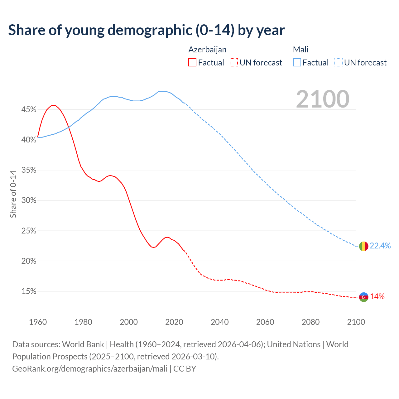 - The share of young demographic (0-15 years old) in Azerbaijan is 21.8% vs 46.1% in Mali.