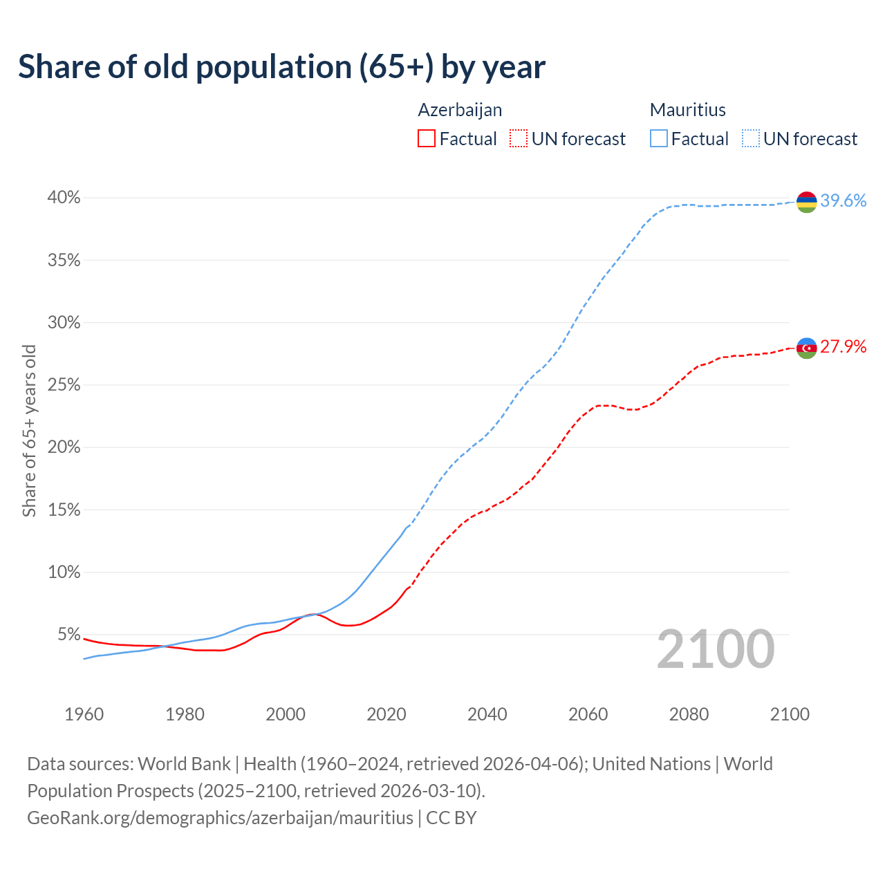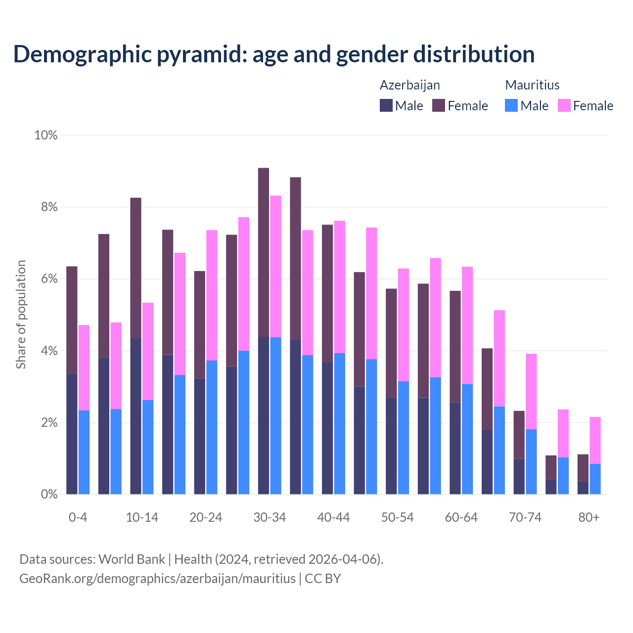 The share of older people aged 65 and over is 8.56% in Azerbaijan and 13.5% in Mauritius. Life expectancy in Azerbaijan compared to Mauritius .