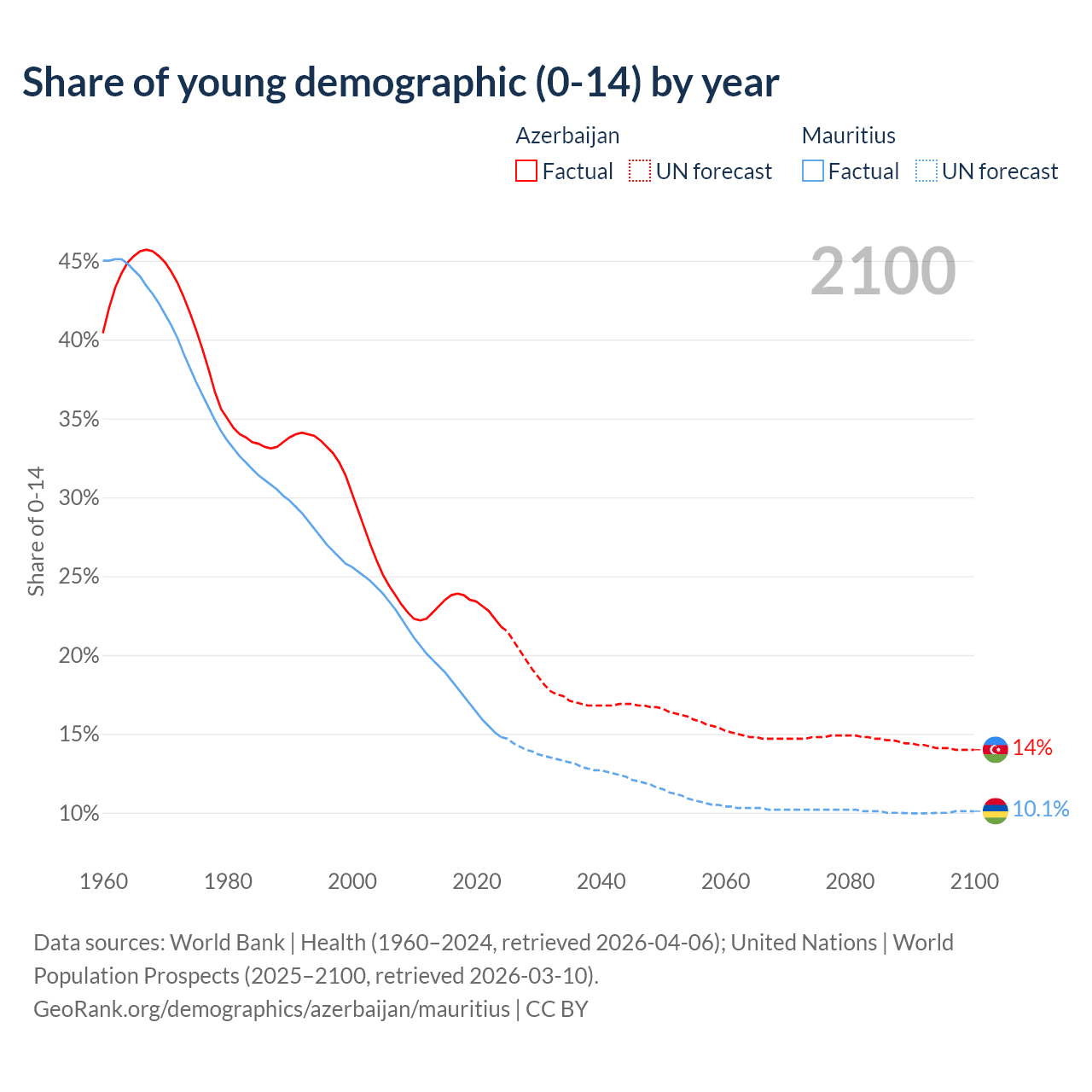 - The share of young demographic (0-15 years old) in Azerbaijan is 21.8% vs 14.8% in Mauritius.