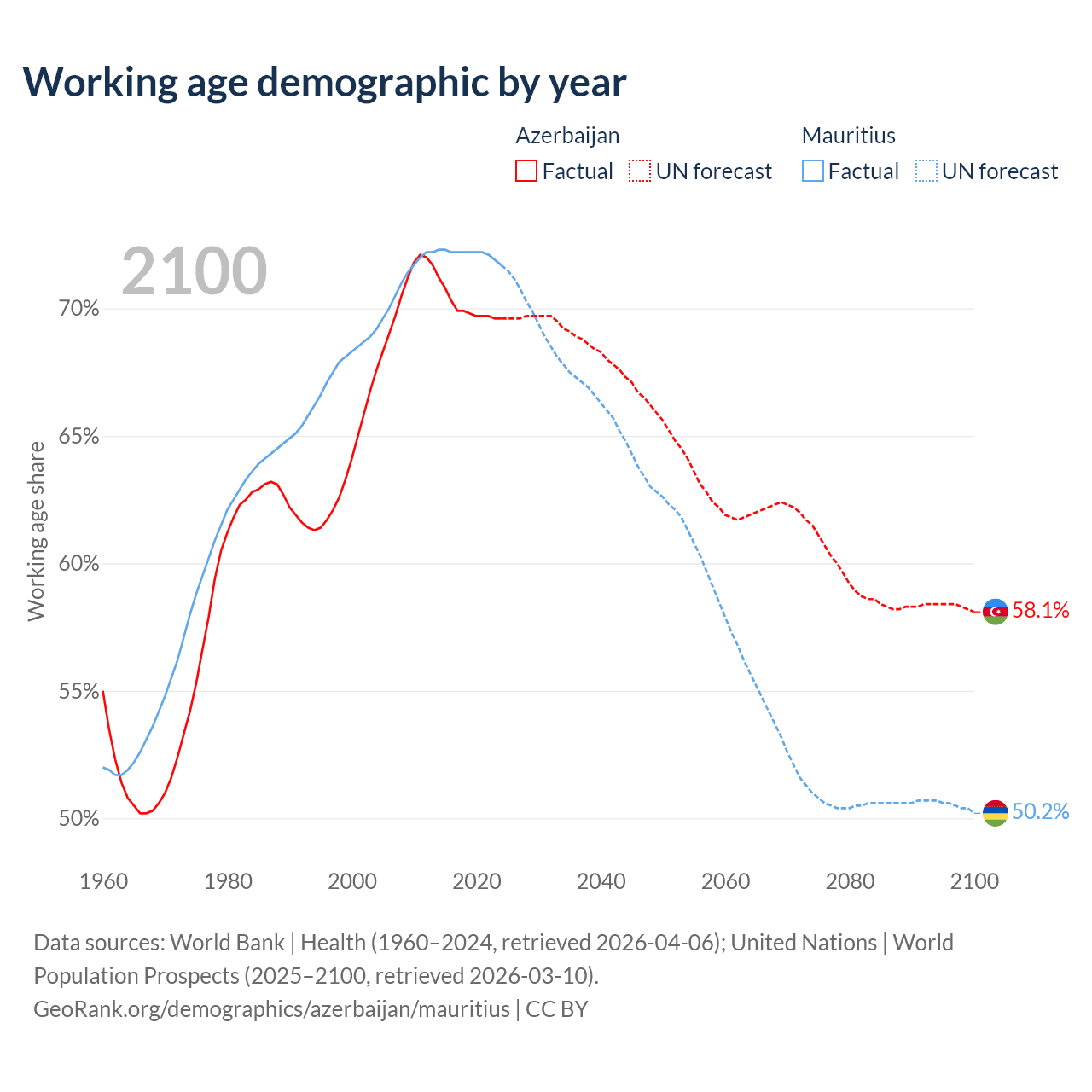 Median age Azerbaijan vs Mauritius, 1960-2100