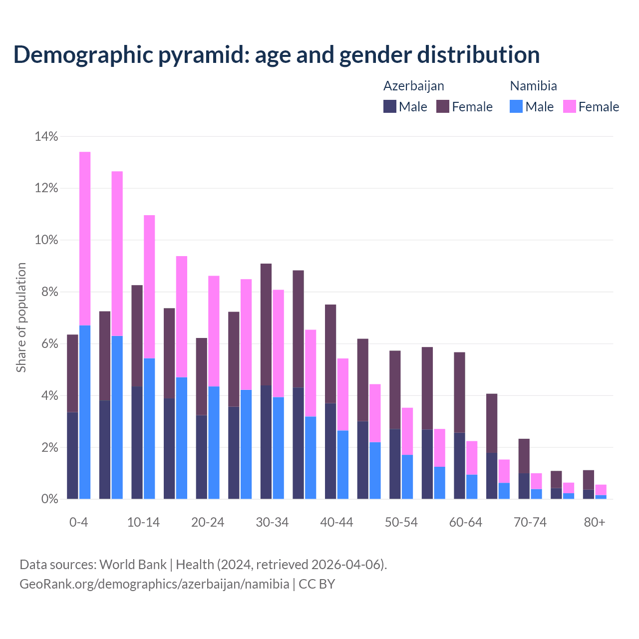 - Azerbaijan is ranked 82/196 by median age (oldest to youngest) vs 147/196 for Namibia.