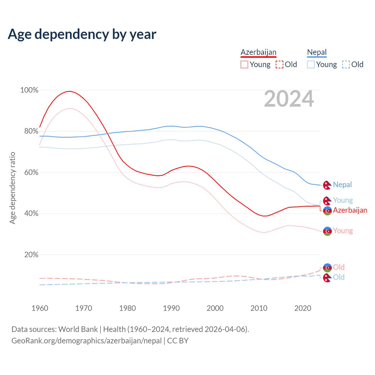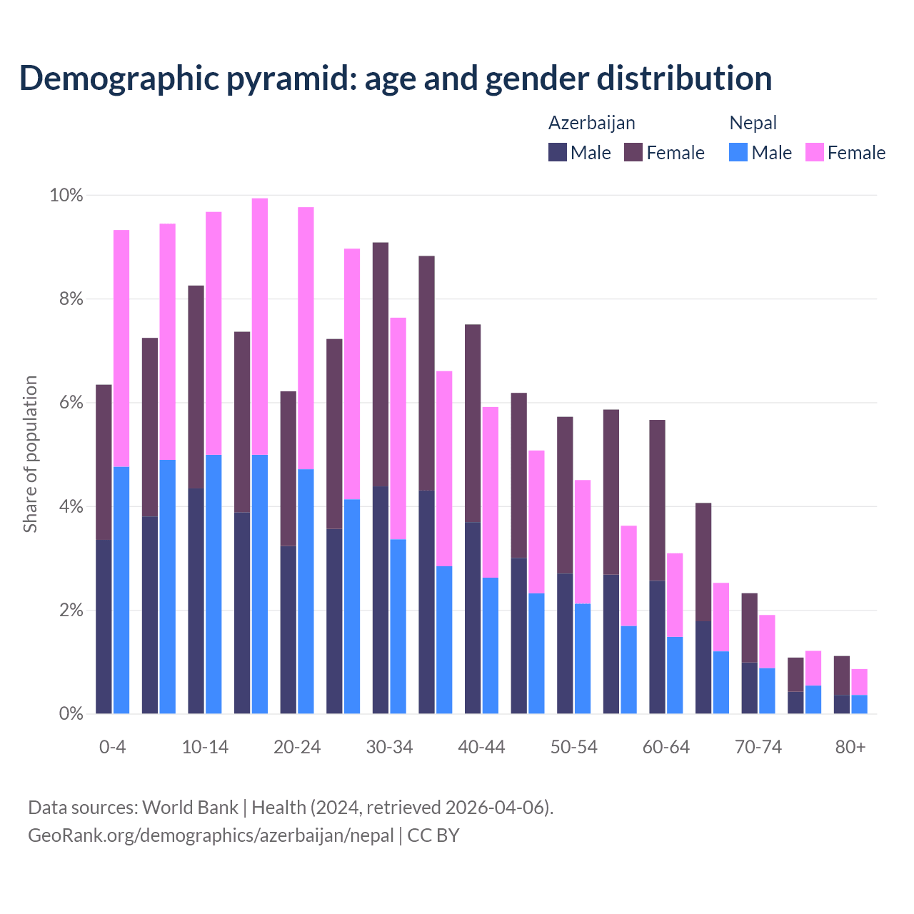- Azerbaijan is ranked 82/196 by median age (oldest to youngest) vs 127/196 for Nepal.