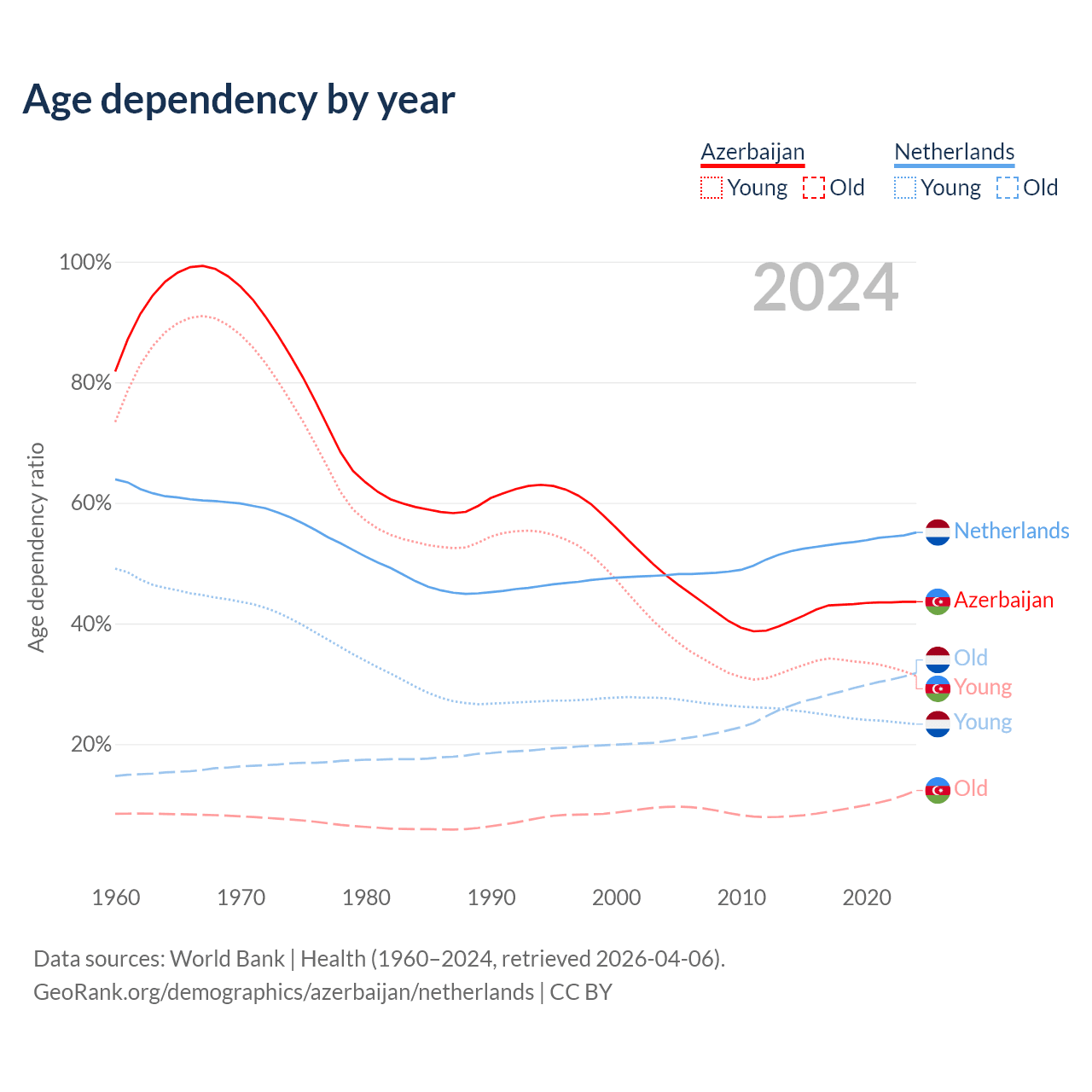 - The share of old-age demographic (65+) in Azerbaijan is 8.56% vs 20.5% in the Netherlands.