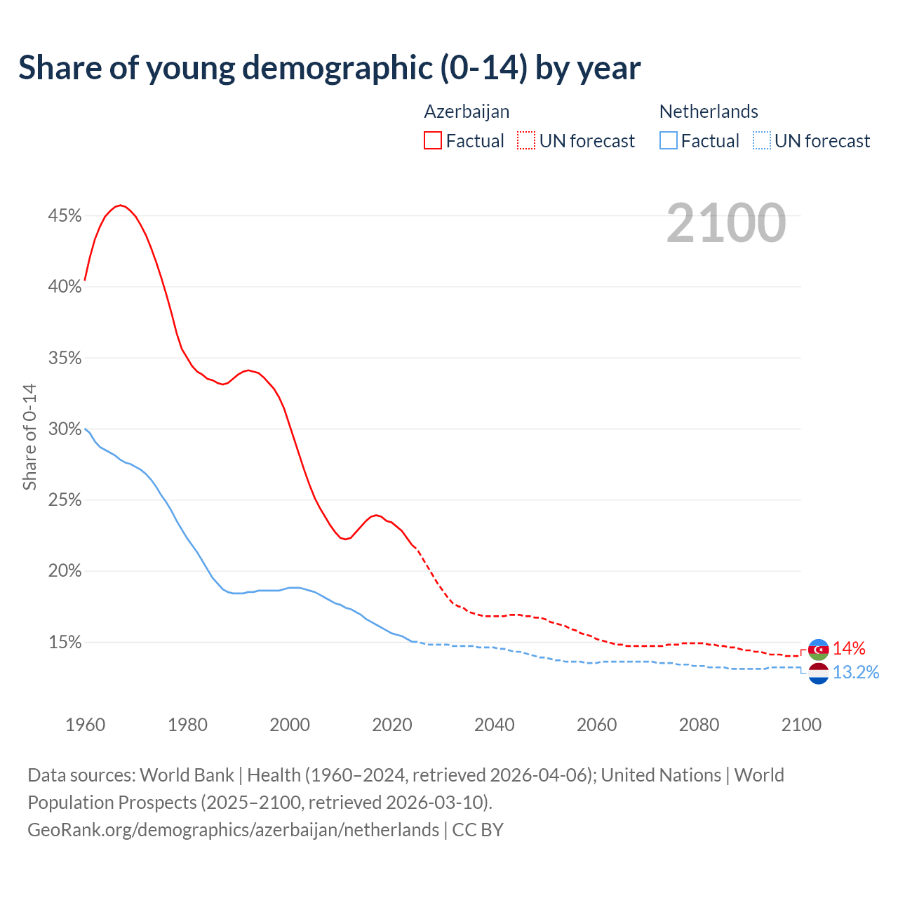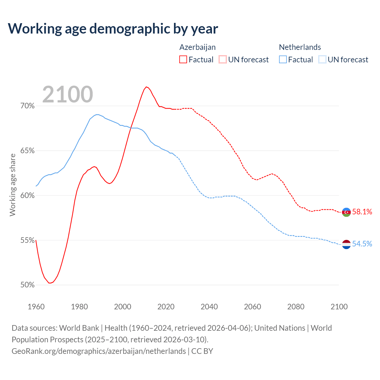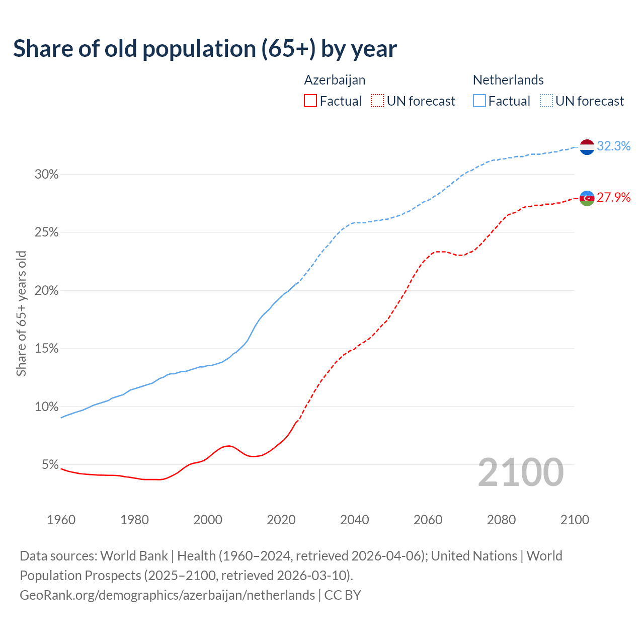 Median age Azerbaijan vs Netherlands, 1960-2100