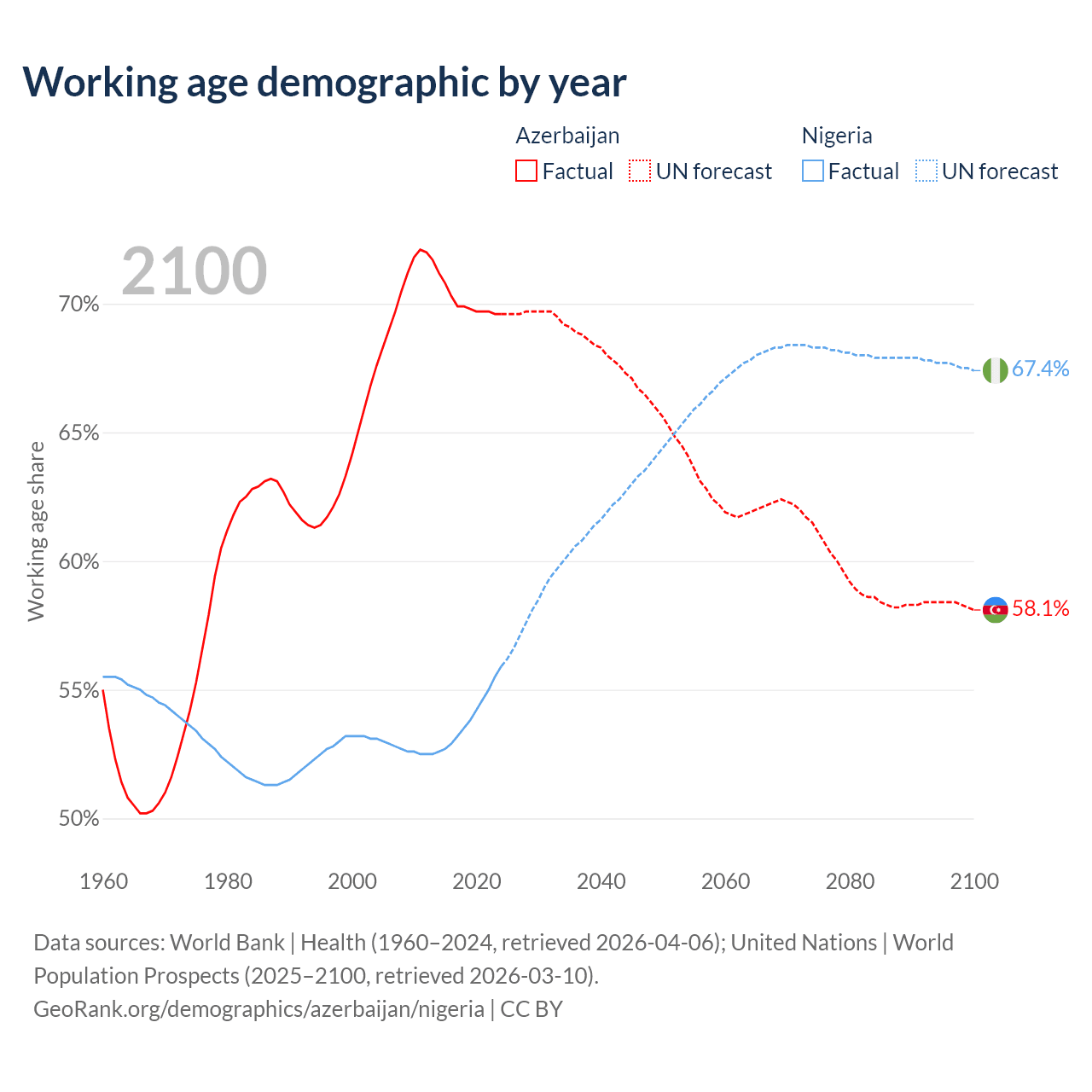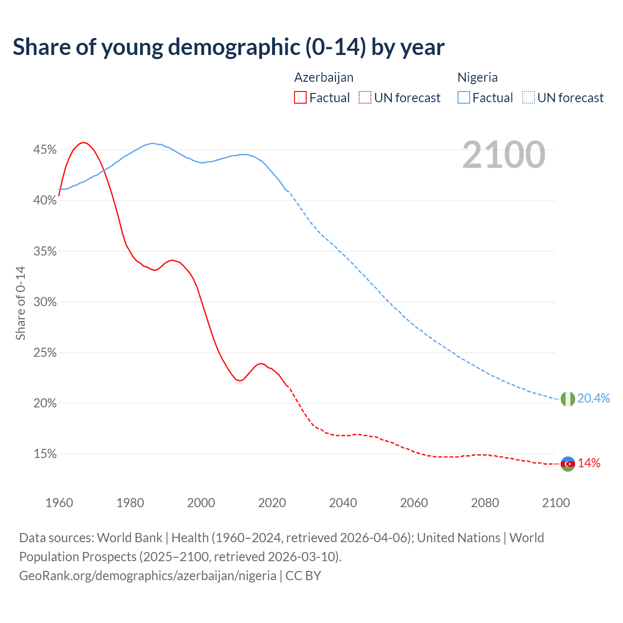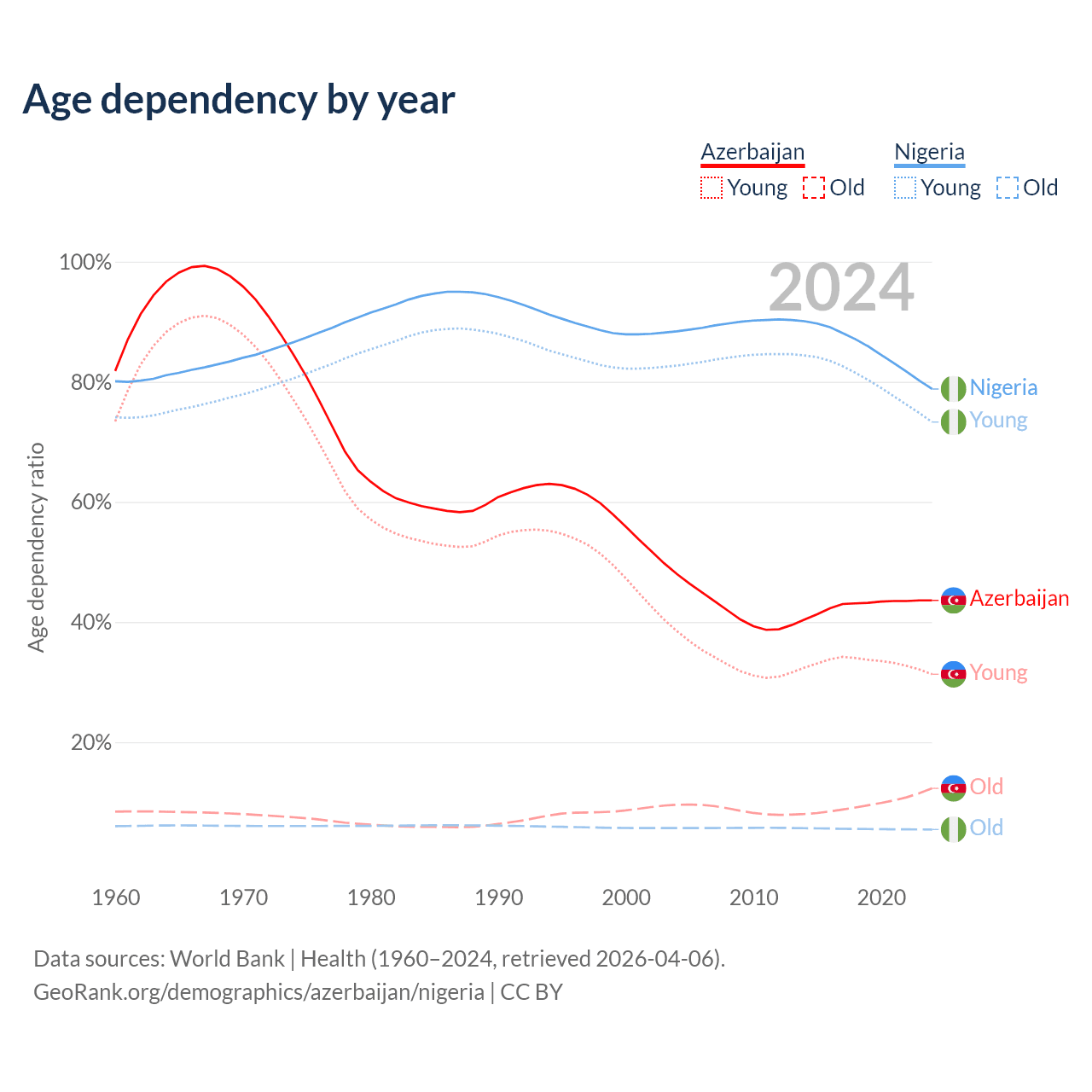 - Azerbaijan is ranked 82/196 by median age (oldest to youngest) vs 178/196 for Nigeria.